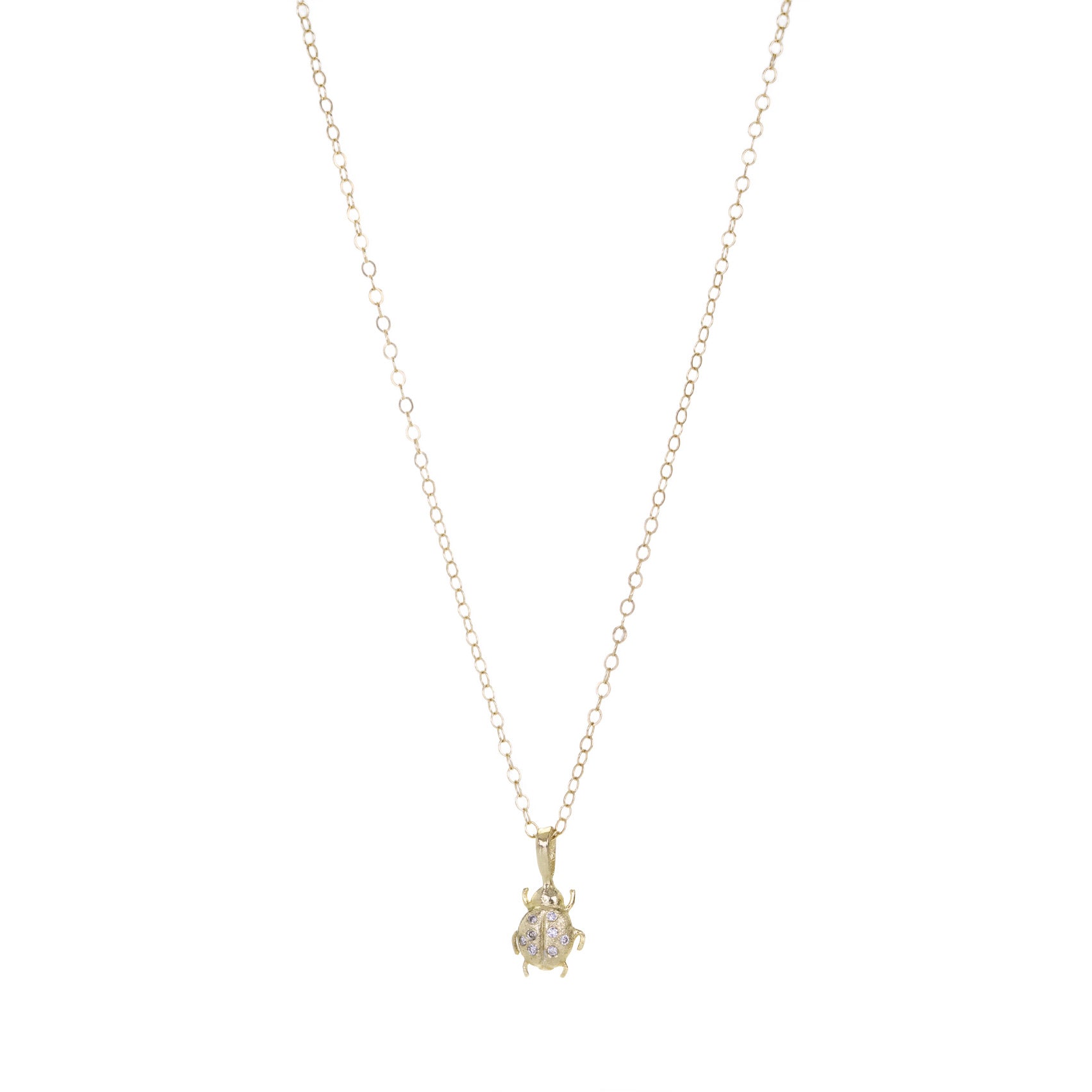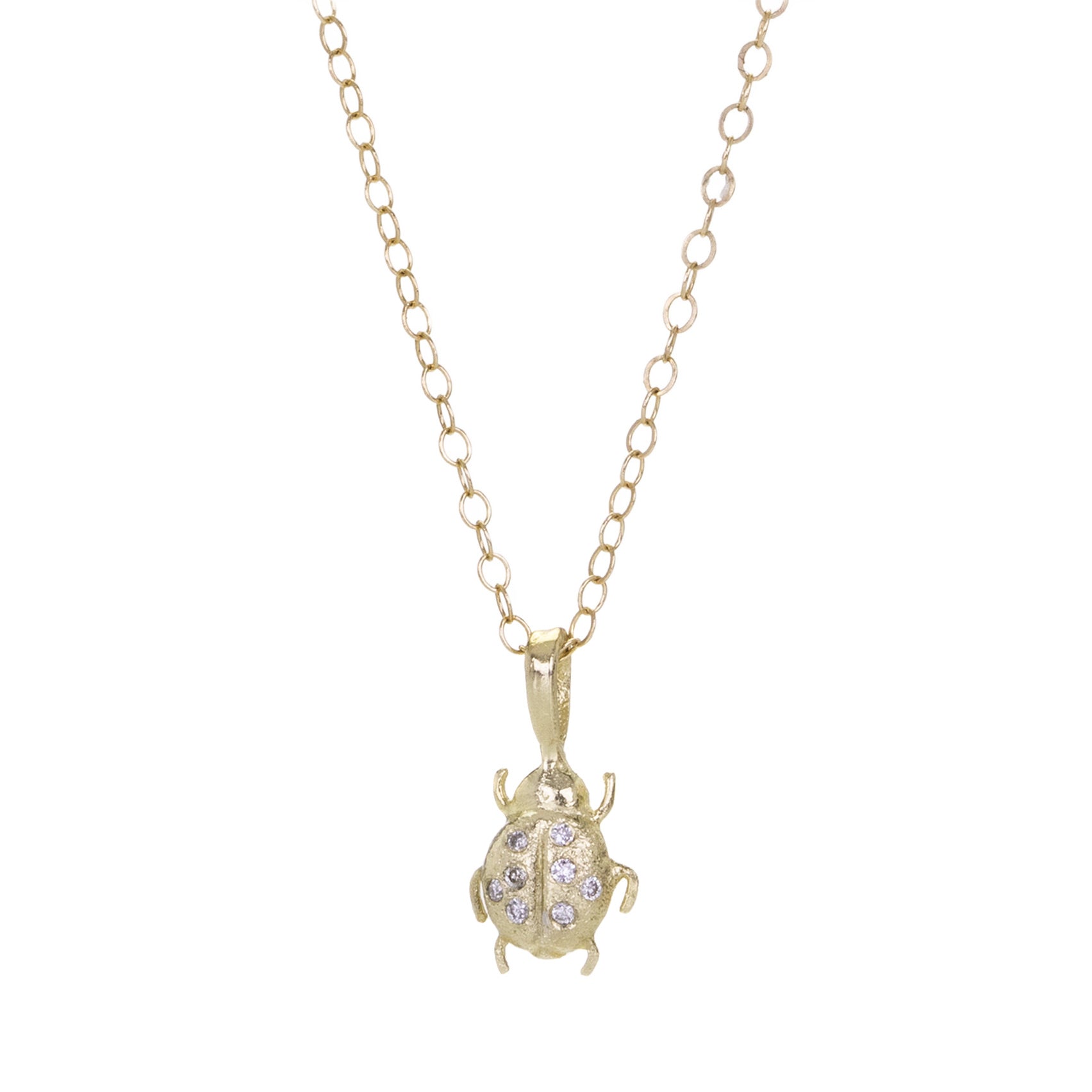 This lucky 14k yellow gold pendant from Acanthus can be worn alone or added to your favorite pendant collection. A charming ladybug features pavé diamonds upon its wings, and the cutest little legs. Total length with bail measures 1/2". Pendant only, chain is sold separately. Handcrafted in Saint Joseph, MN, U.S.