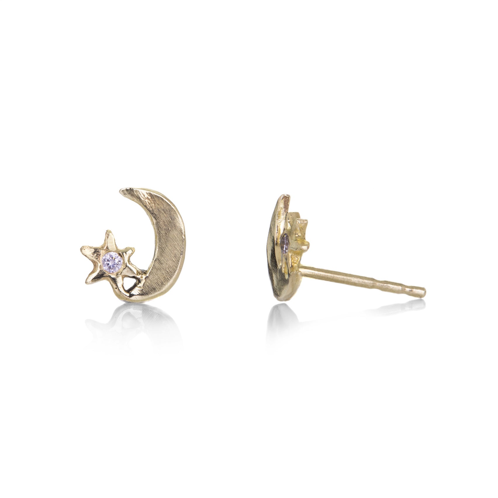 Pay homage to the great beyond in this adorable pair of 14k yellow gold studs from Acanthus. Crescent moons with tiny stars feature white diamond accents. Studs measure 3/8". Handcrafted in Saint Joseph, MN, U.S.