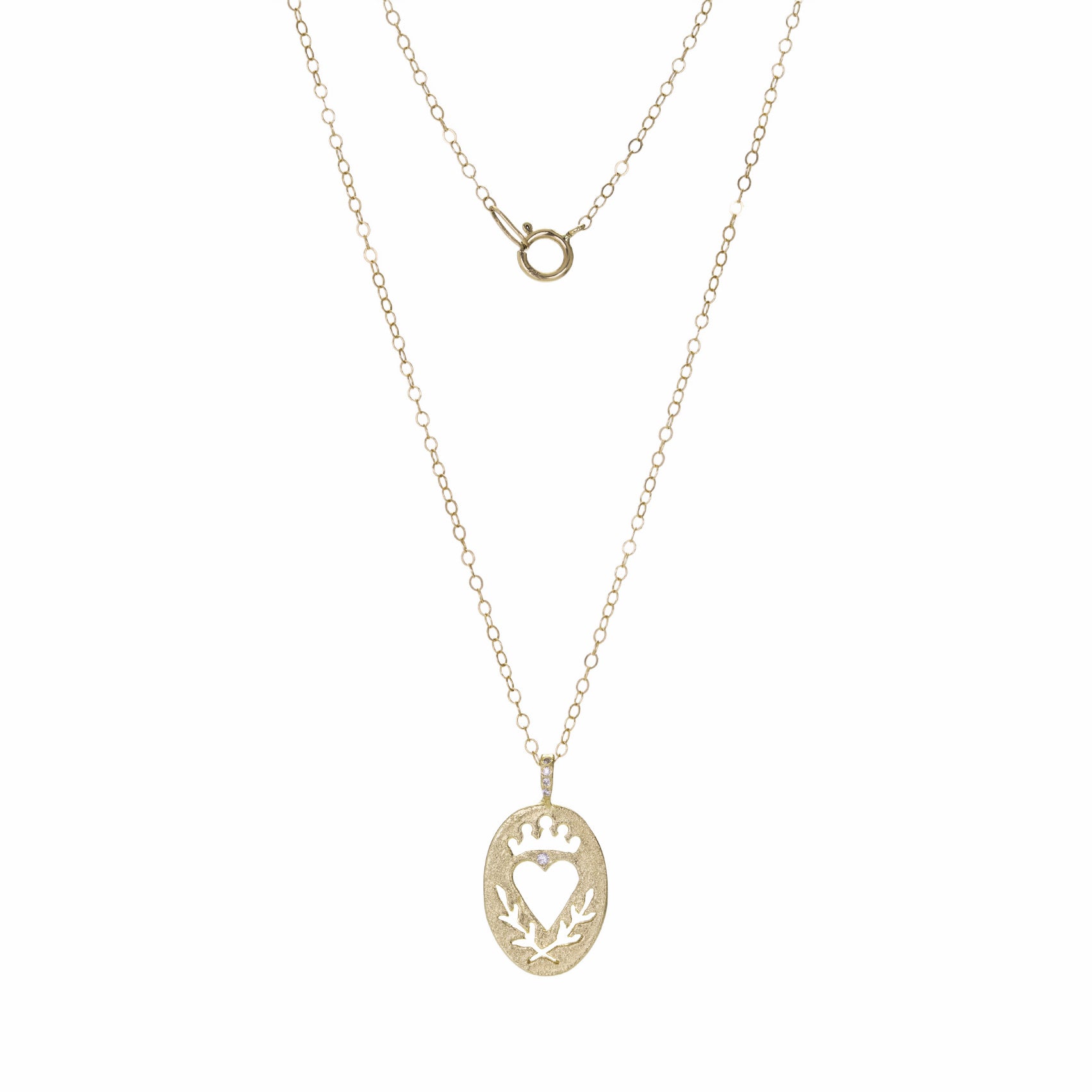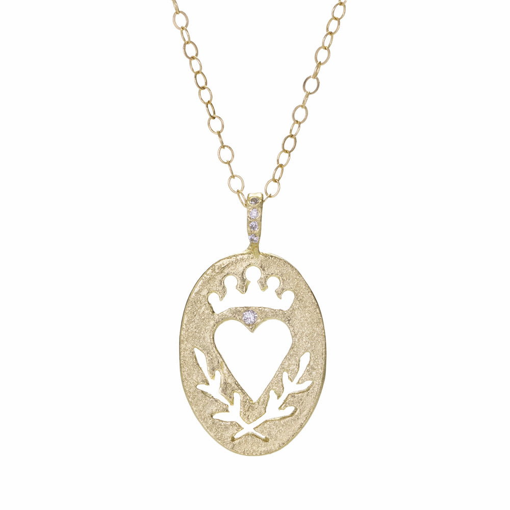 Love is king in this 14k yellow gold necklace from Acanthus. An oval pendant features a crowned heart with vine and leaf and diamond accents. Negative space brings this design even closer to the soul. Pendant length measures 7/8”. Adjustable chain length measures 16" - 18” with a spring ring clasp. Handcrafted in Saint Joseph, MN, U.S.