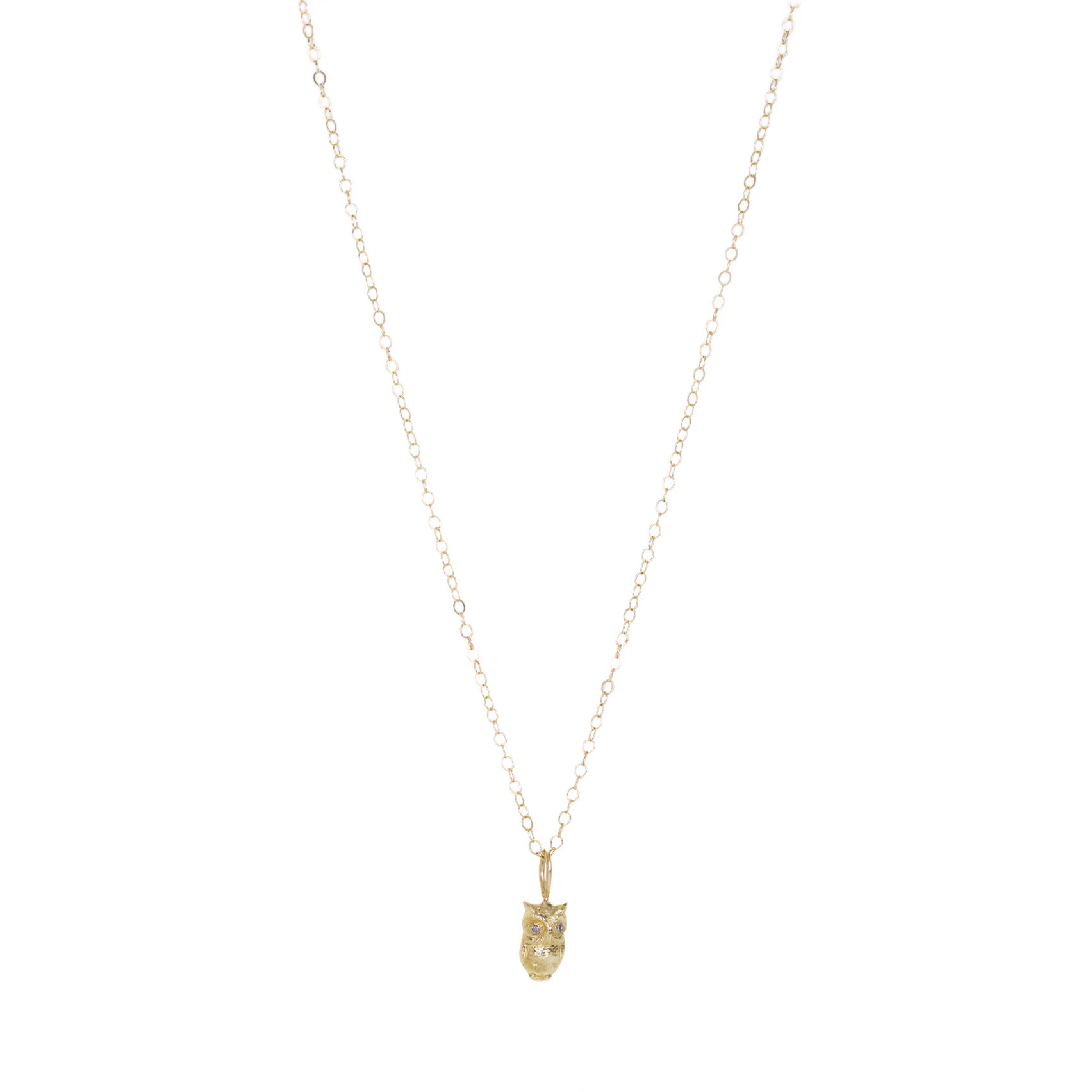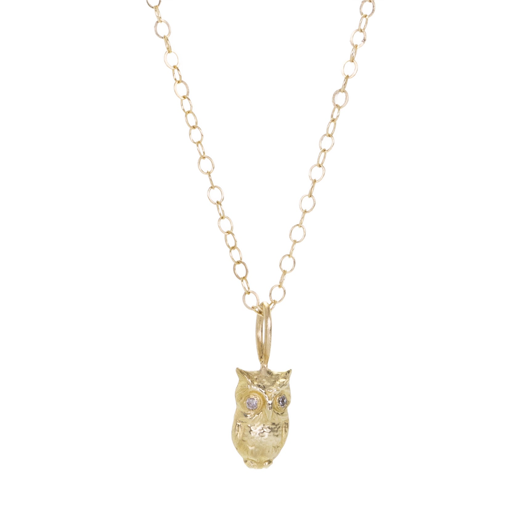 A symbol of all knowing wisdom, this 14k yellow gold pendant from Acanthus features a sweetly carved owl with diamond eyes. With the simplicity of an ancient aesthetic, this charm brings a small but powerful addition to your pendant collection. Total length with bail measures 1/2". Pendant only, chain is sold separately. Handcrafted in Saint Joseph, MN, U.S.