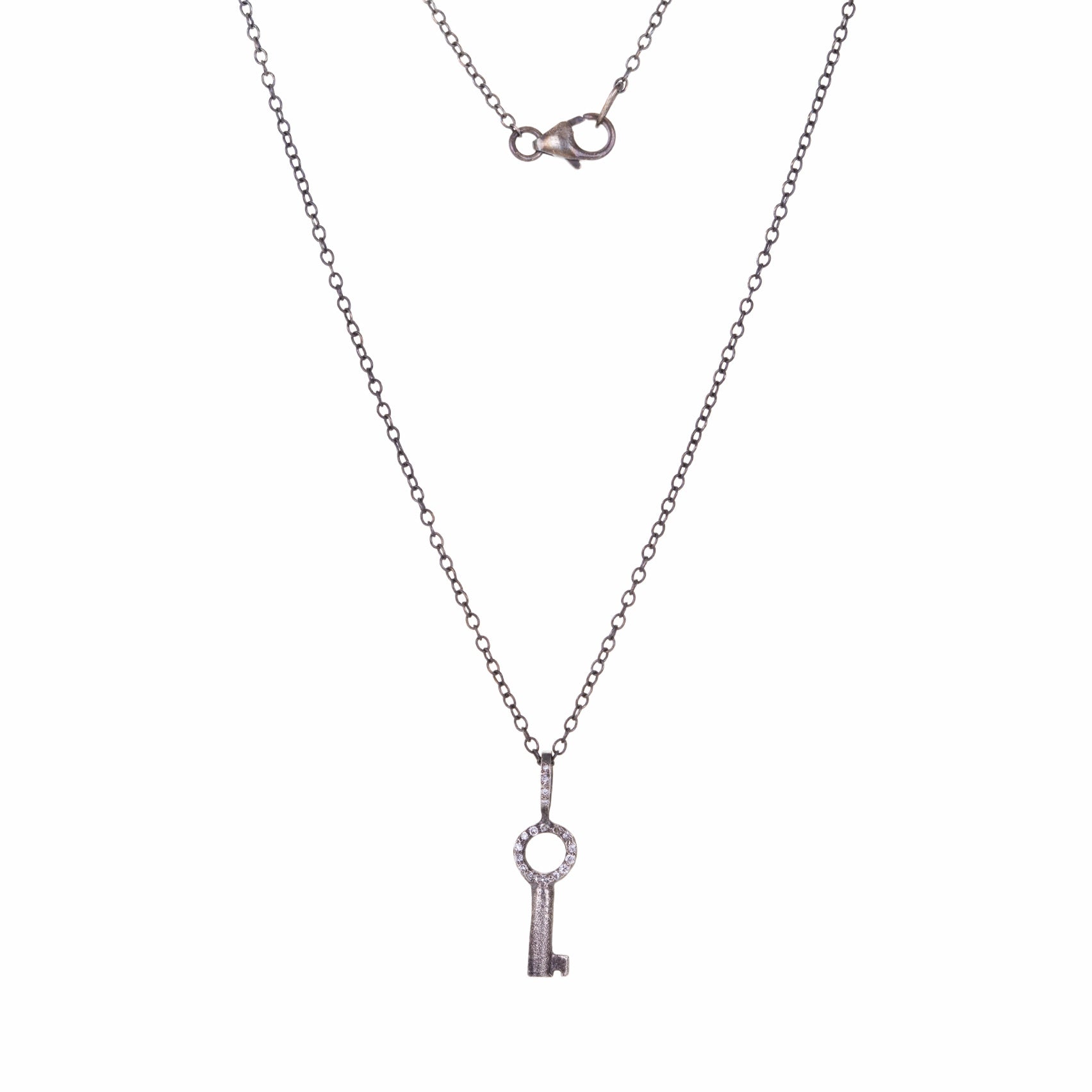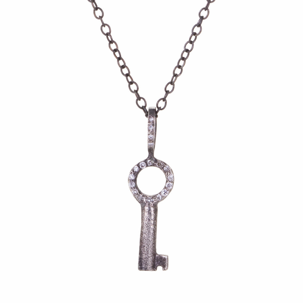 Unlock your endless potential in this oxidized sterling silver necklace from Acanthus. A rustic round key pendant features white diamond accents throughout. Pendant length measures 7/8” with bail. Adjustable chain length measures 16" - 18" with a lobster clasp. Handcrafted in Saint Joseph, MN, U.S.