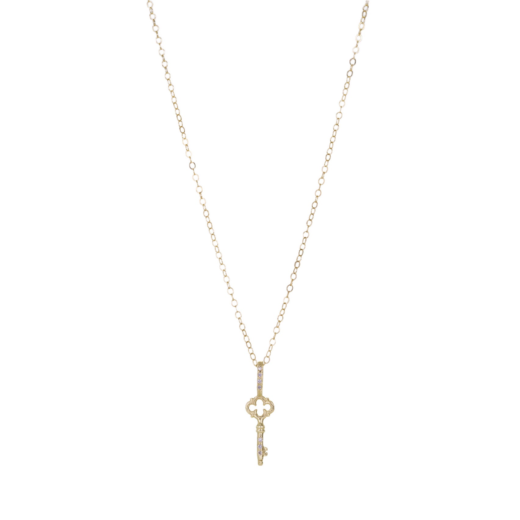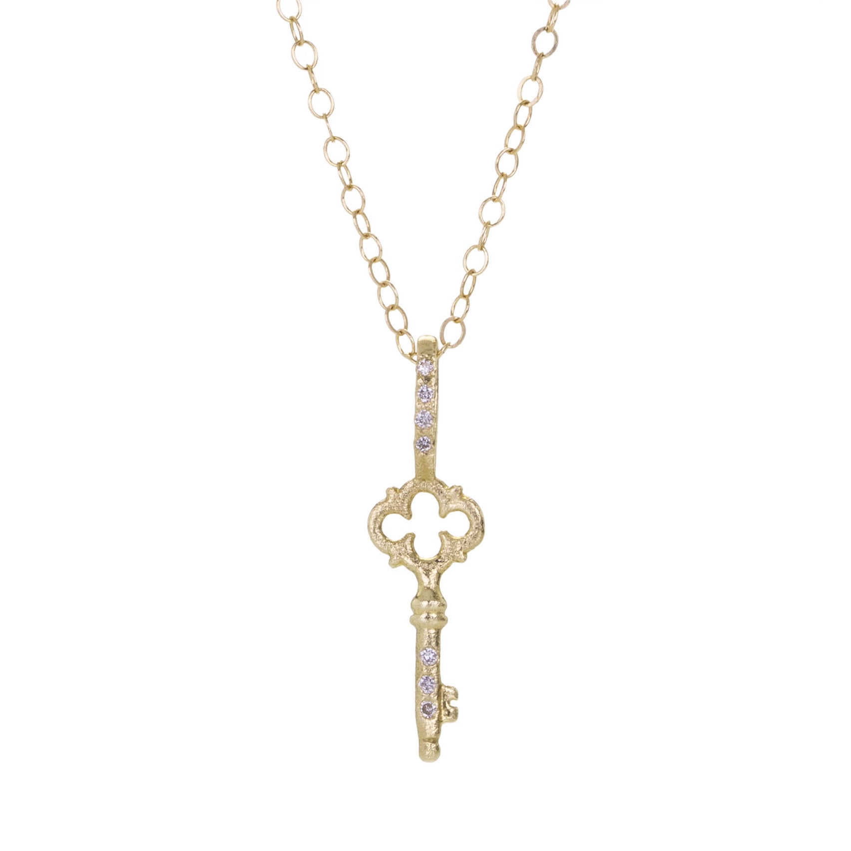 Unlock your endless potential in this 14k yellow gold pendant from Acanthus. An elegant quatrefoil key features white diamond accents throughout. Pendant length measures 7/8” with bail. Pendant only, chain is sold separately. Handcrafted in Saint Joseph, MN, U.S.
