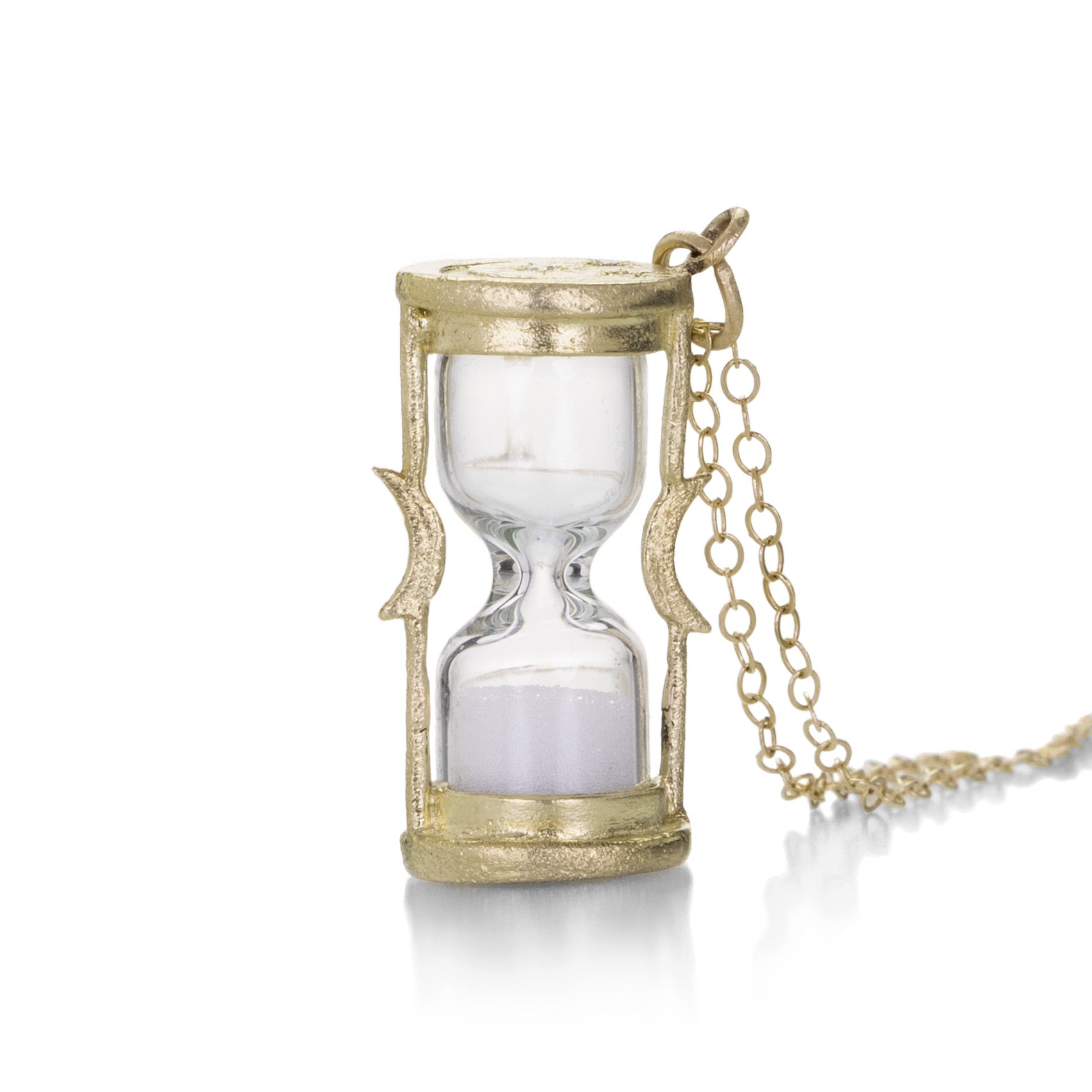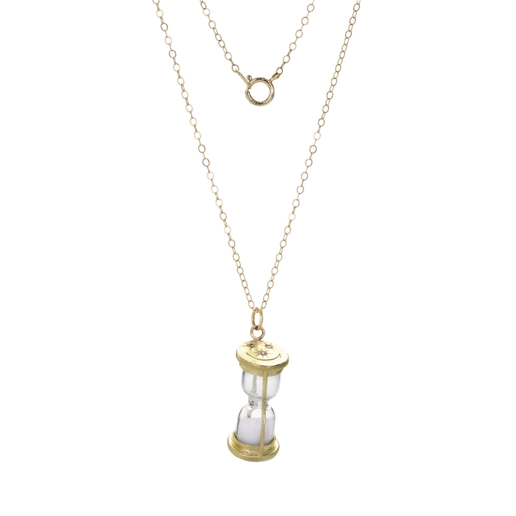 Time knows no limits, but waits for no one in this eccentric 14k yellow gold necklace from Acanthus. A working hourglass pendant features crescent moons on the sides and a carved moon and stars on the top with diamond accents. Pendant length measures 7/8”. Necklace length measures 20” with a spring ring clasp. Handcrafted in Saint Joseph, MN, U.S.