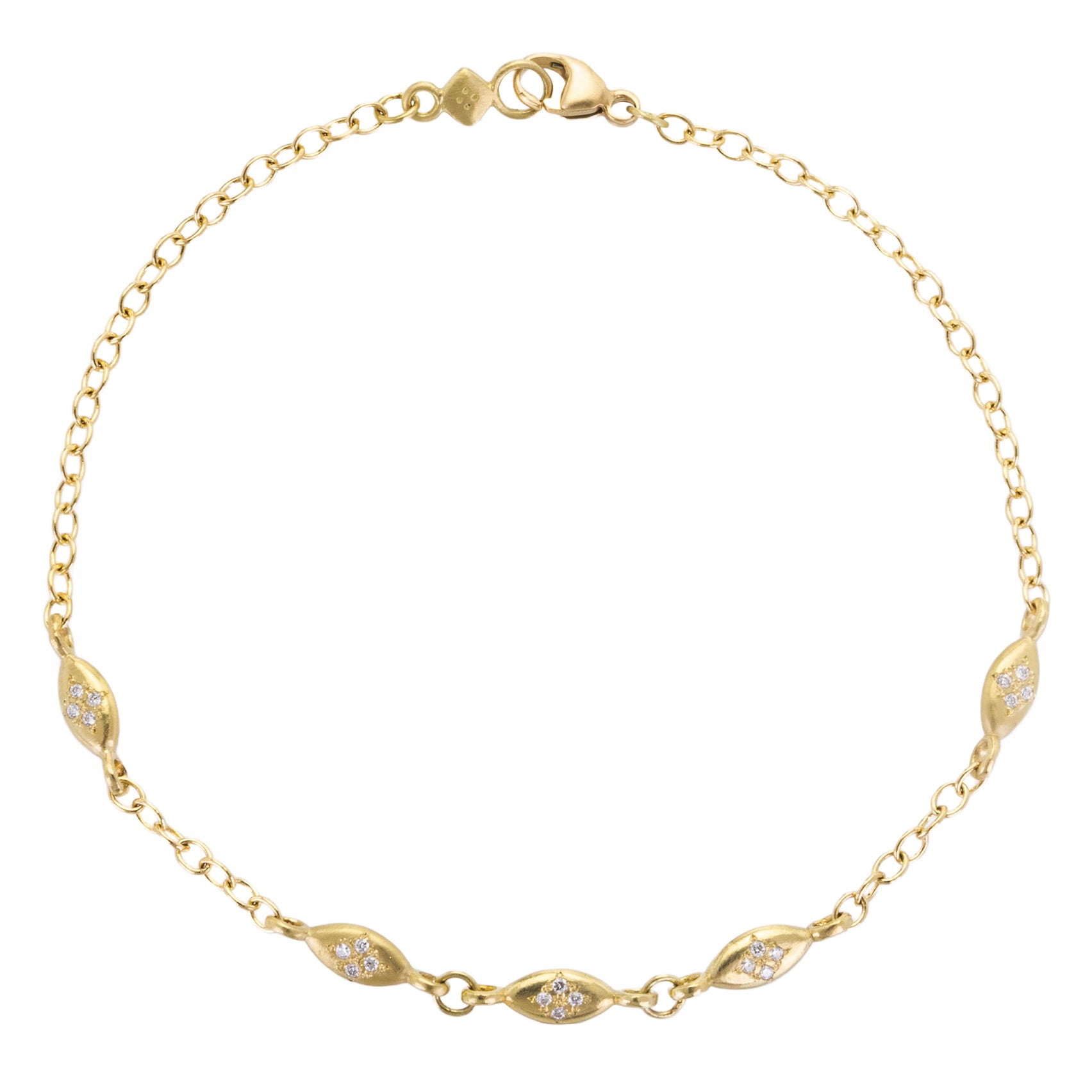 Elegantly detailed, this delicate 18k yellow gold chain bracelet from Adel Chefridi features five marquise shaped, double sided links set with white diamonds totaling 0.09cttw. Add a touch of sparkle and gold to your wrist stack, or give this piece as a perfect gift for the jewelry lover in your life! Total length with lobster clasp measures 7". Handcrafted in Rhinebeck, NY, U.S.