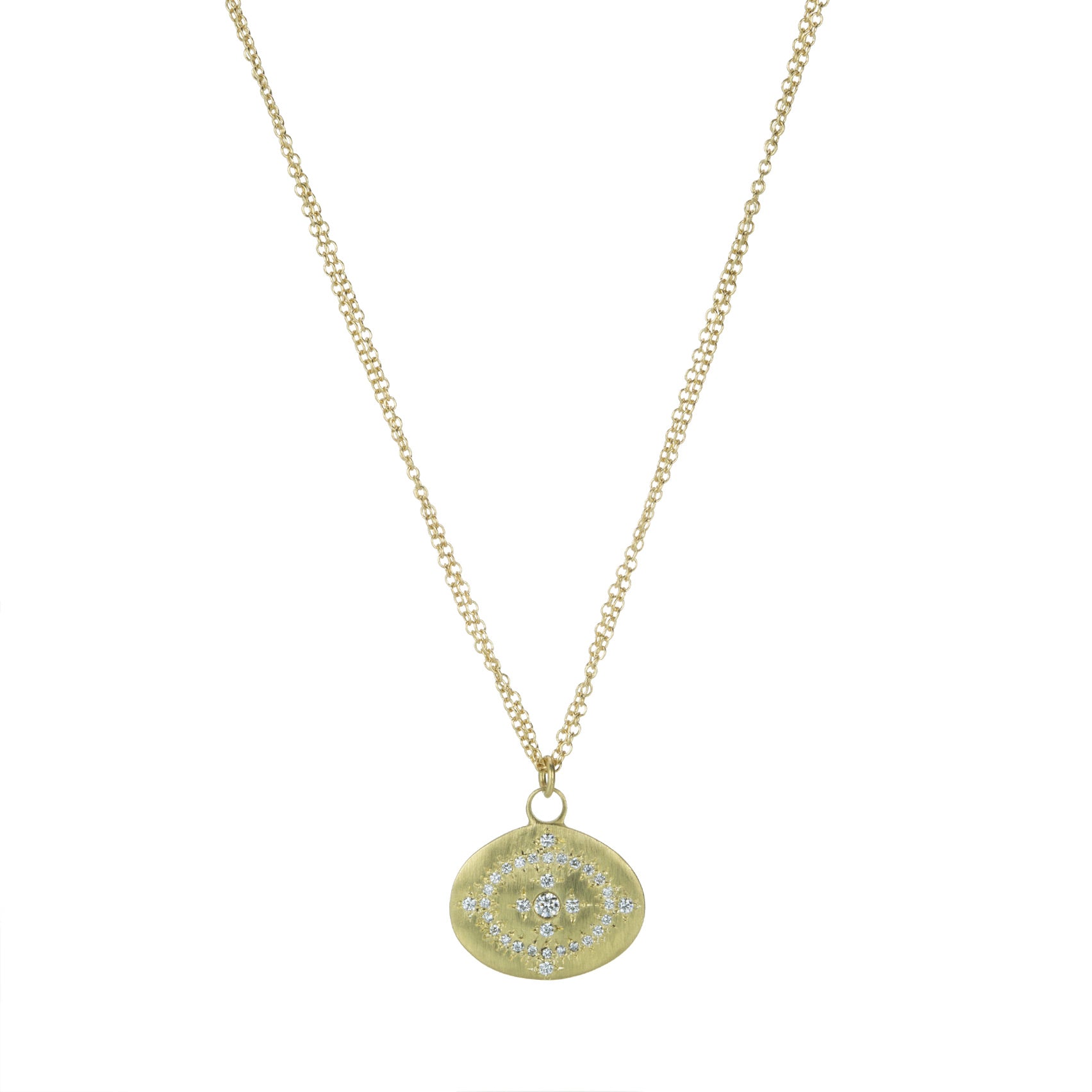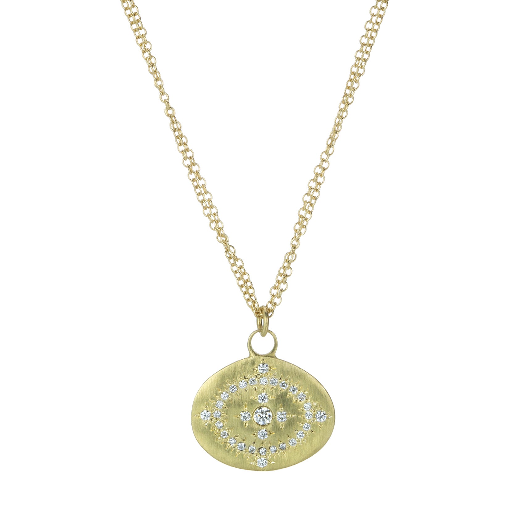 Soak in the sparkling details of this 18k yellow gold necklace from Adel Chefridi. An organically oval pendant features a satin finish with an array of diamonds totaling 0.17cttw. Pendant measures 1/2" . Chain length with lobster clasp measures 16-18“. Handcrafted in Rhinebeck, NY, U.S.