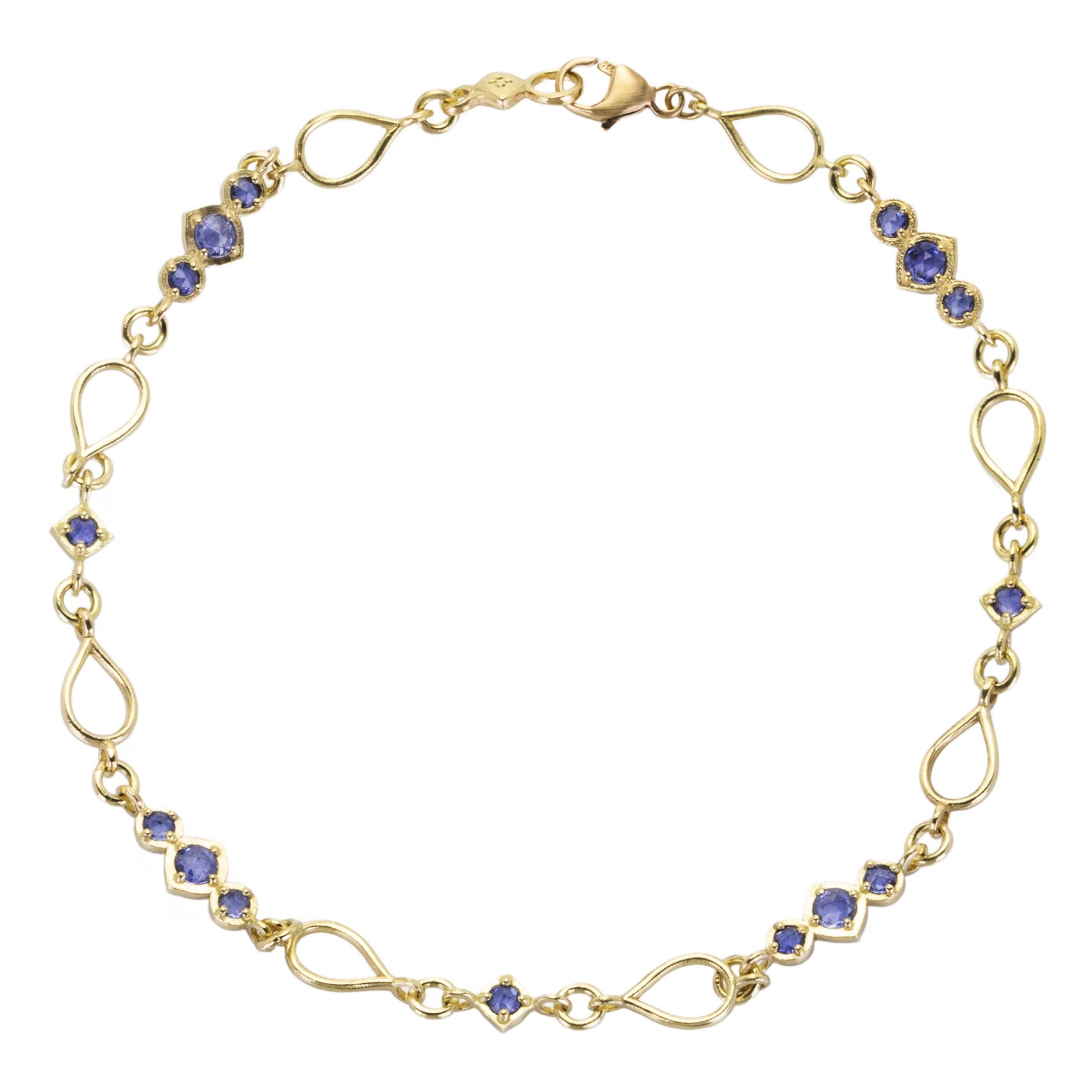 Light and airy with brilliant blue color throughout, this 18k yellow gold bracelet from Adel Chefridi is drenched in keen detail. Single and triple rose cut blue sapphire stations float among open polished links of gold. Total length with lobster clasp measures 7 1/4". Handcrafted in Rhinebeck, NY, U.S.