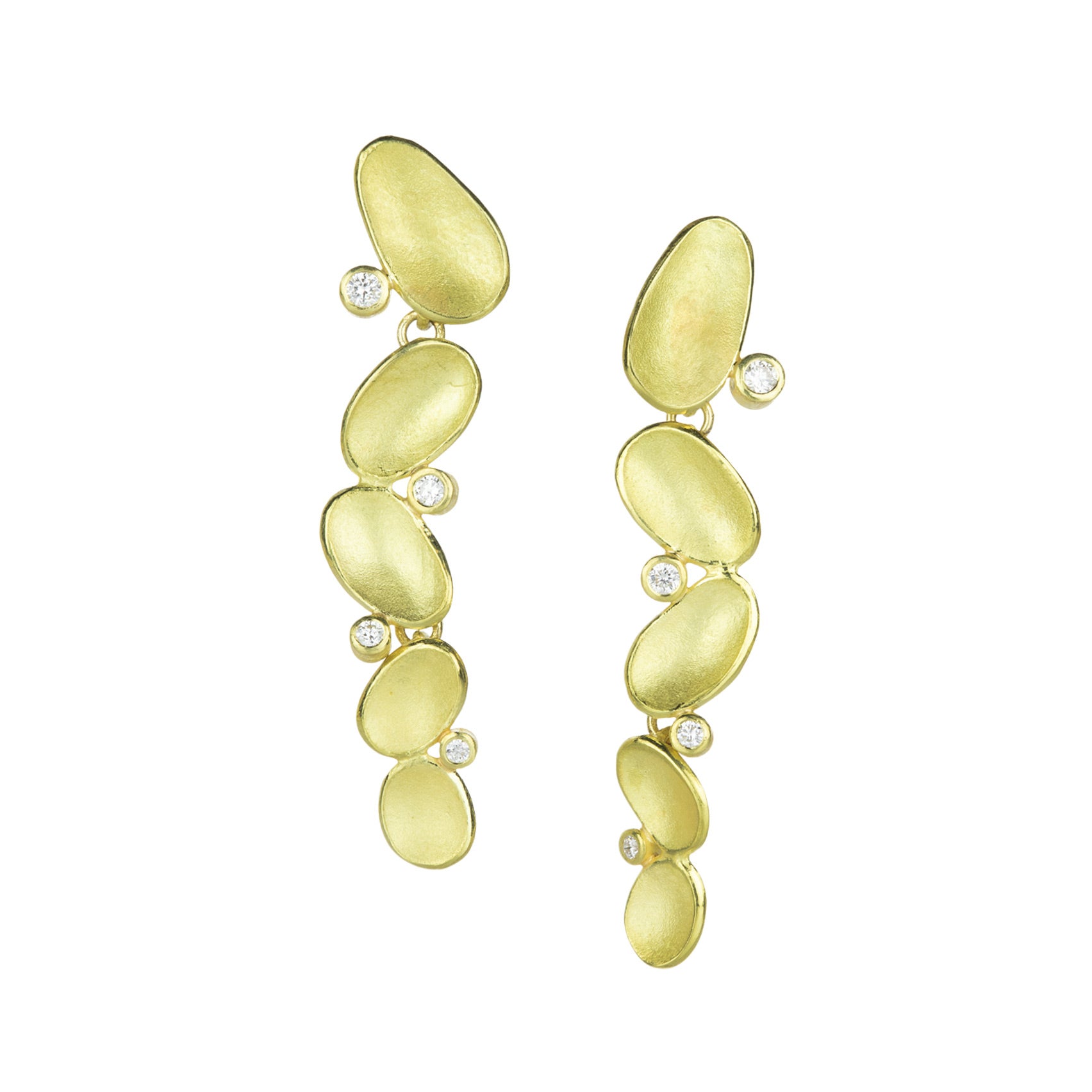 Cascading shell forms trail down among eight bezel set white diamonds totaling 0.15cttw in this pair of 18k yellow gold post earrings from Barbara Heinrich. Multiple linked connections allow for graceful, fluid motion. Total length measures 1 1/2". Handcrafted in Rochester, NY, U.S.