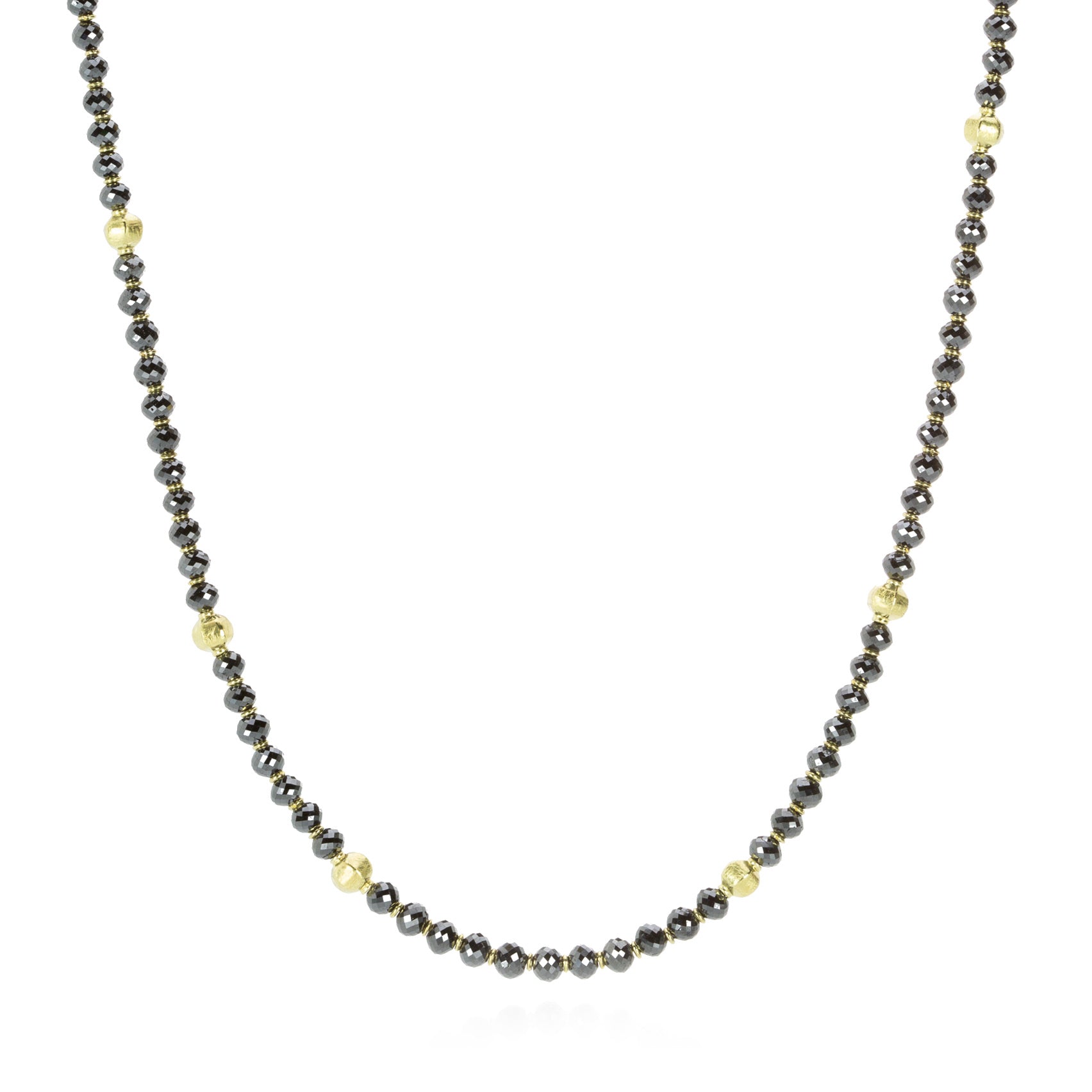 Go bold in black and gold in this 18k yellow gold necklace from Barbara Heinrich. A treasury of black diamond beads totaling 38.42cttw are interspersed with eight gold lantern shaped beads and tiny jump rings between each stone. Total length measures 16½” with a 1½” extension chain and lobster clasp. Handcrafted in Rochester, NY, U.S.