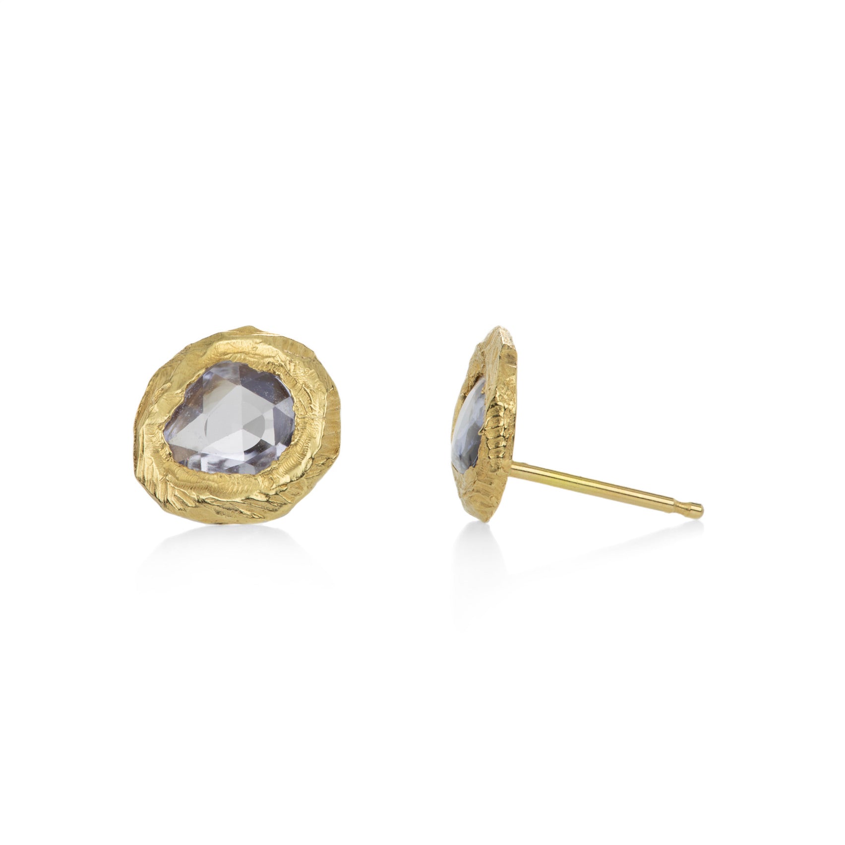 Set your spirit free in this pair of 18k yellow gold studs from Page Sargisson. Freeform rose cut blue sapphires totaling approximately 1.0cttw are set in textured, hand carved bezels with a pale, bluesy glow. Studs measure approximately 3/8" x 1/4". Handcrafted in Brooklyn, NY, U.S.