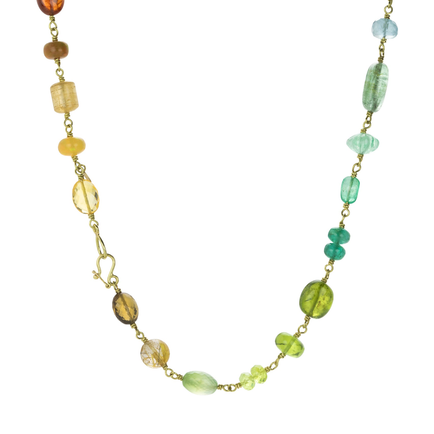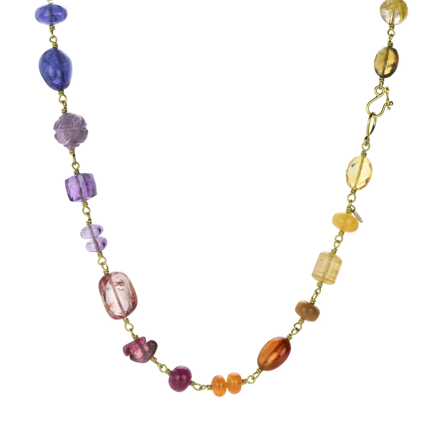 Wear the magic of the rainbow! This absolutely luscious 18k yellow gold spun sugar necklace from Mallary Marks covers all the bases with a fun, luxurious style. Smoky quartz, rutilated quartz, prehnite, chrysoberyl, peridot, emerald, tourmaline, aquamarine, chalcedony, tanzanite, amethyst, ruby, mandarin garnet, spessartite garnet, Ethiopian opal, and American opal beads are carefully arranged and hand wrapped for a lovely drape. Total length measures 18” with a locking hook clasp. Handcrafted in New York, NY, U.S.