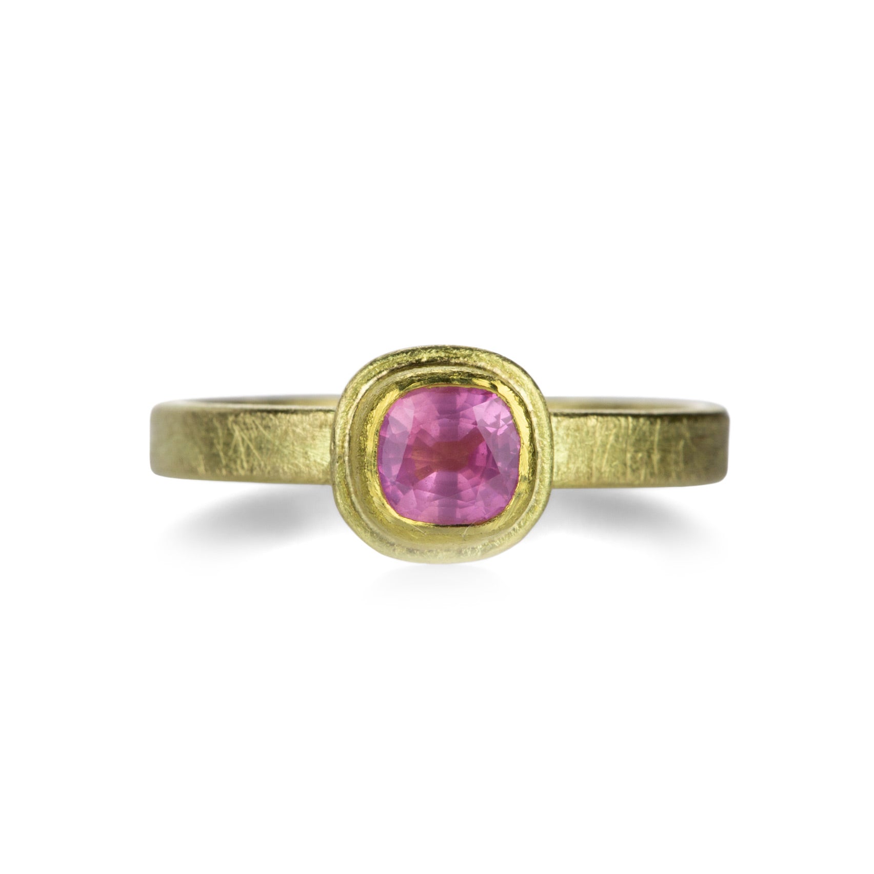 The passion is palpable in this 18k and 22k yellow gold ring from Petra Class. A cushion cut, faceted pink sapphire sits pretty in a stepped bezel. The square brushed gold band measures 2.2mm wide. Size 6.5. Handcrafted in San Francisco, CA, U.S.