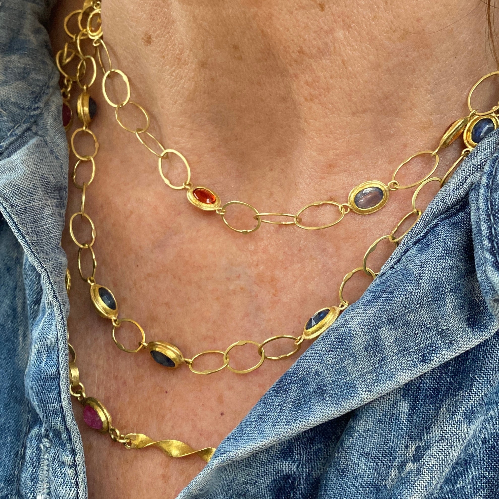 Airy and luxurious with a handcrafted touch, this 18k yellow gold textured oval link chain necklace from Petra Class is a vibrant addition to your neck party! With stations of double sided 22k yellow gold bezel set faceted blue sapphires, layer it up or wear it alone for a soft, subtle statement. Total length with hook clasp measures 18". Handcrafted in San Francisco, CA, U.S.
