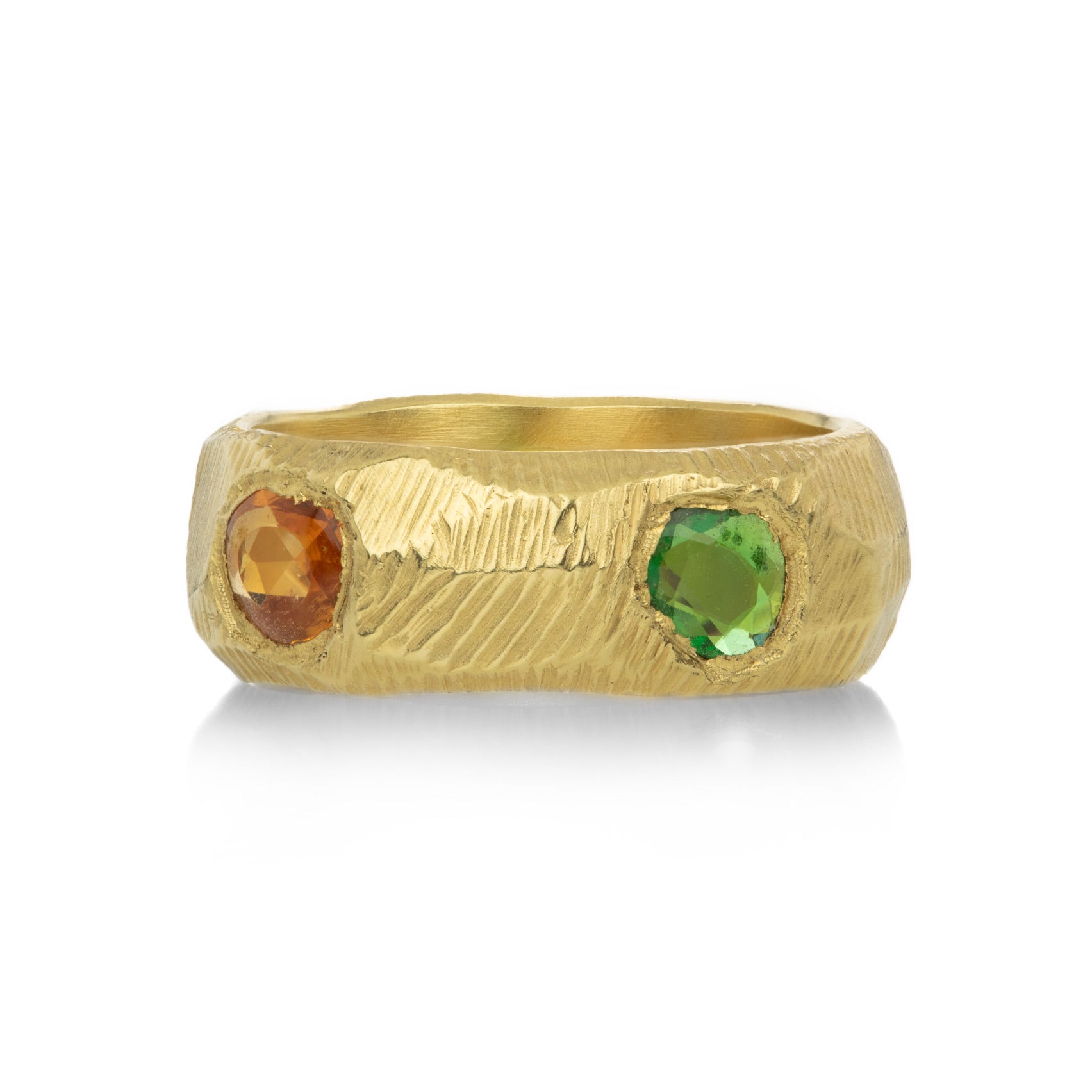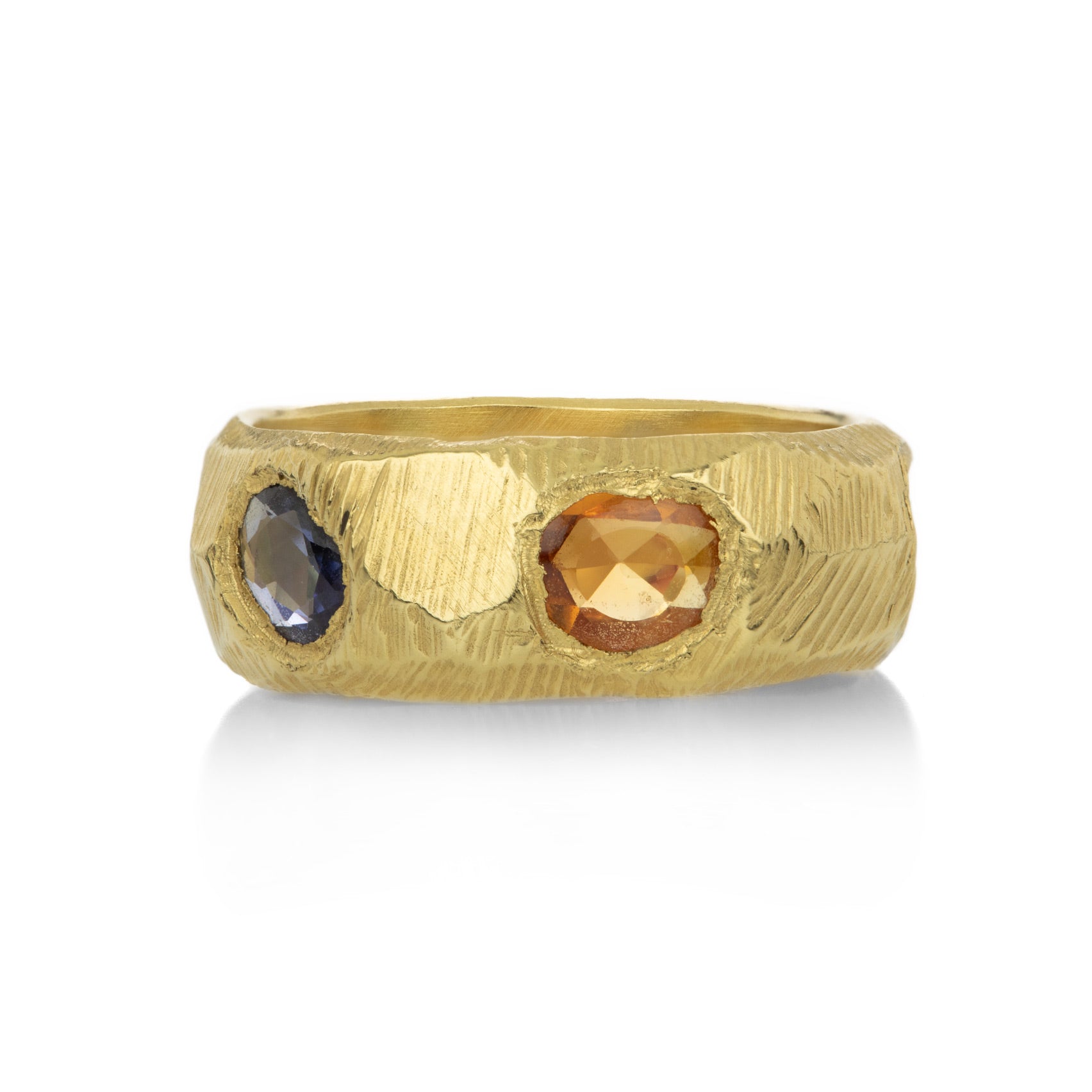 Wear a statement of rugged refinery in this hand carved 18k yellow gold ring from Page Sargisson. The comfortably wide, deliciously textured band features a color burst of four freeform, rose cut multicolored sapphires totaling approximately 1.25 - 1.50cttw. Band width measures approximately 7.5mm. Size 6.5. Handcrafted in Brooklyn, NY, U.S.