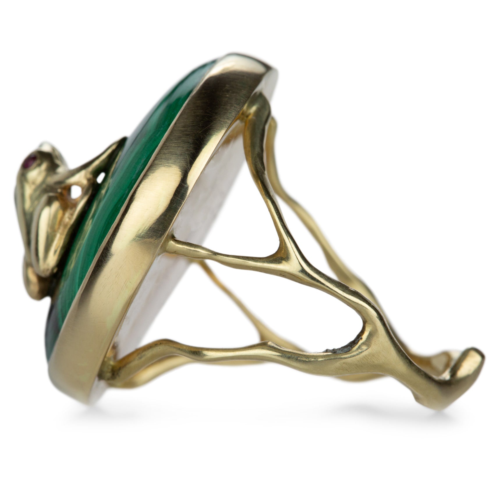Keep a reminder that patience pays close to your heart in this whimsical 14k yellow gold branch ring from Annette Ferdinandsen, featuring a gleaming malachite cabochon in a minimalist bezel. Atop the stone sits a 14k yellow gold ruby-eyed frog prince, waiting patiently for his moment in the sun. Stone measures 7/8" in diameter. Size 6.75. Handcrafted in Hudson Valley, NY, U.S.