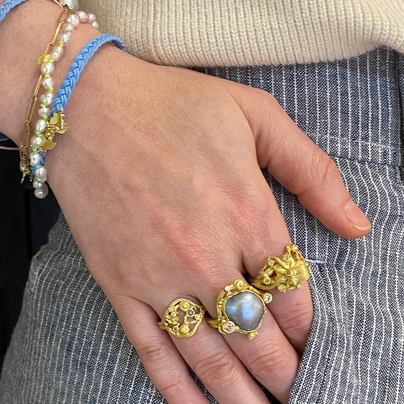 Flourishing with hand carved flora, fauna, and dewy diamonds, this 18k yellow gold ring from Lene Vibe blooms like a garden of Earthly delight! White diamonds totaling 0.02cttw and green diamonds totaling 0.05cttw bring this treasure to life. Size 5.75. Handcrafted in Denmark.