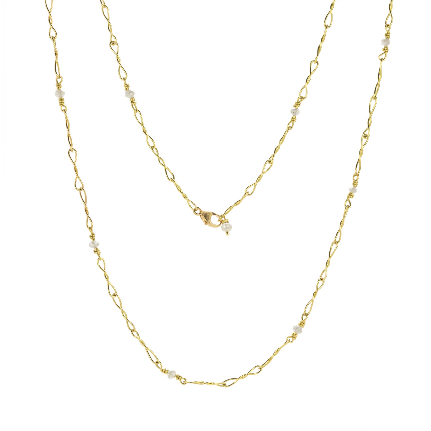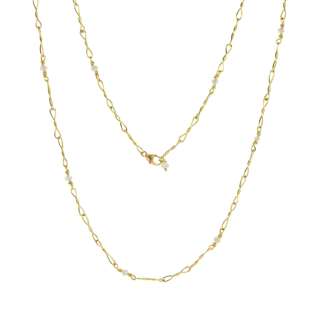 Layer on the links in this 18k yellow gold twisted link chain necklace from Lene Vibe. Faceted gray diamond beads twinkle and shine along the hand formed links. Total length with lobster clasp measures 18". Handcrafted in Denmark.