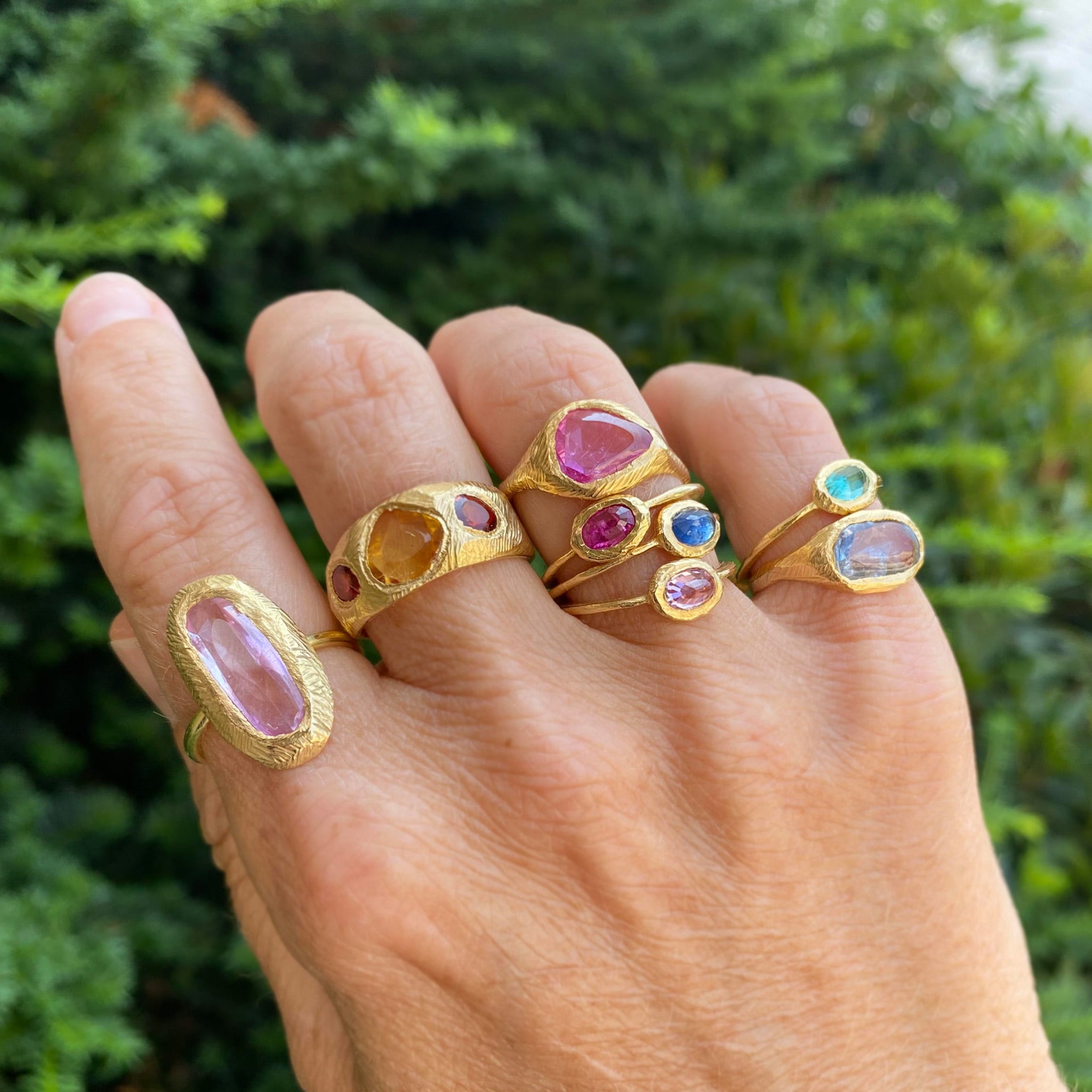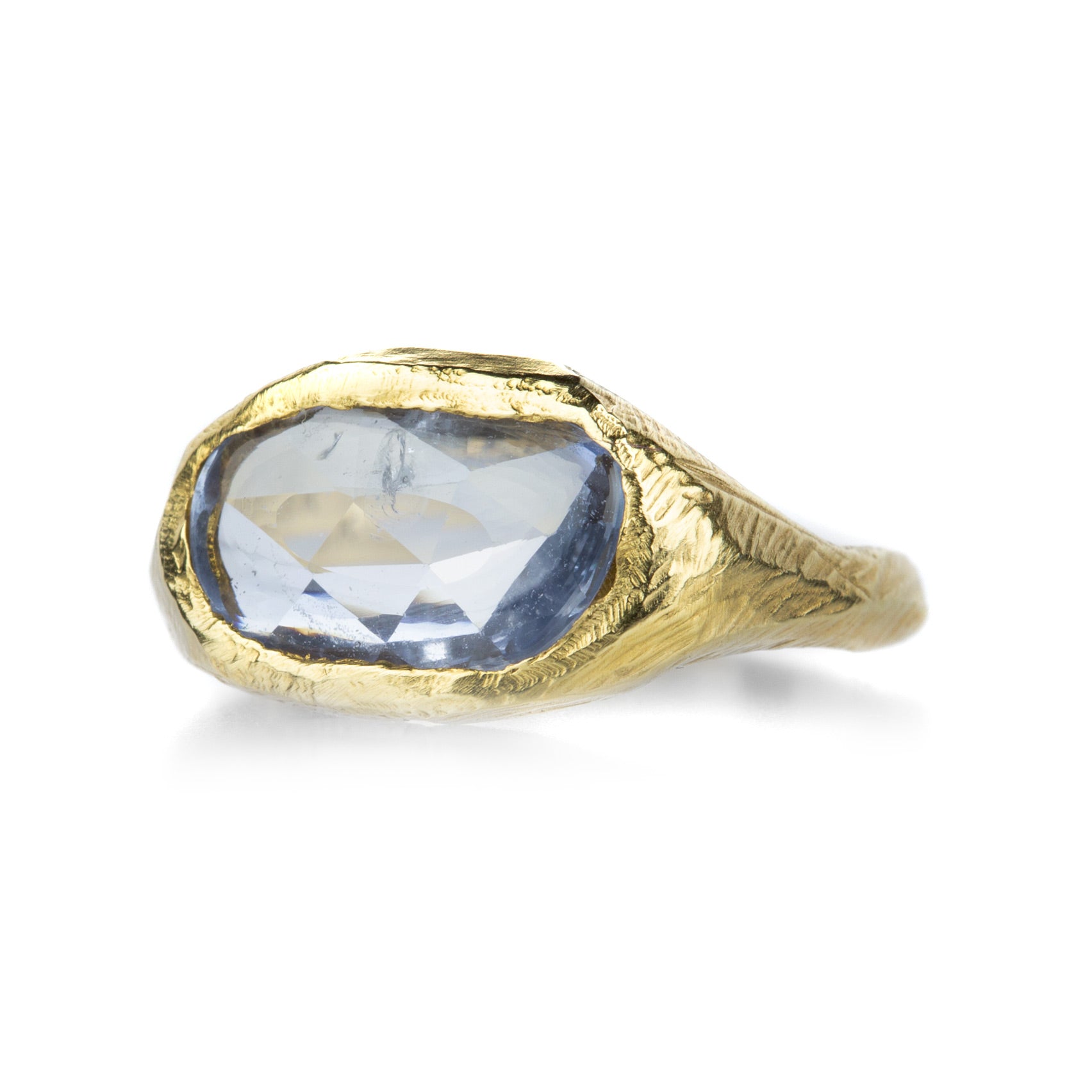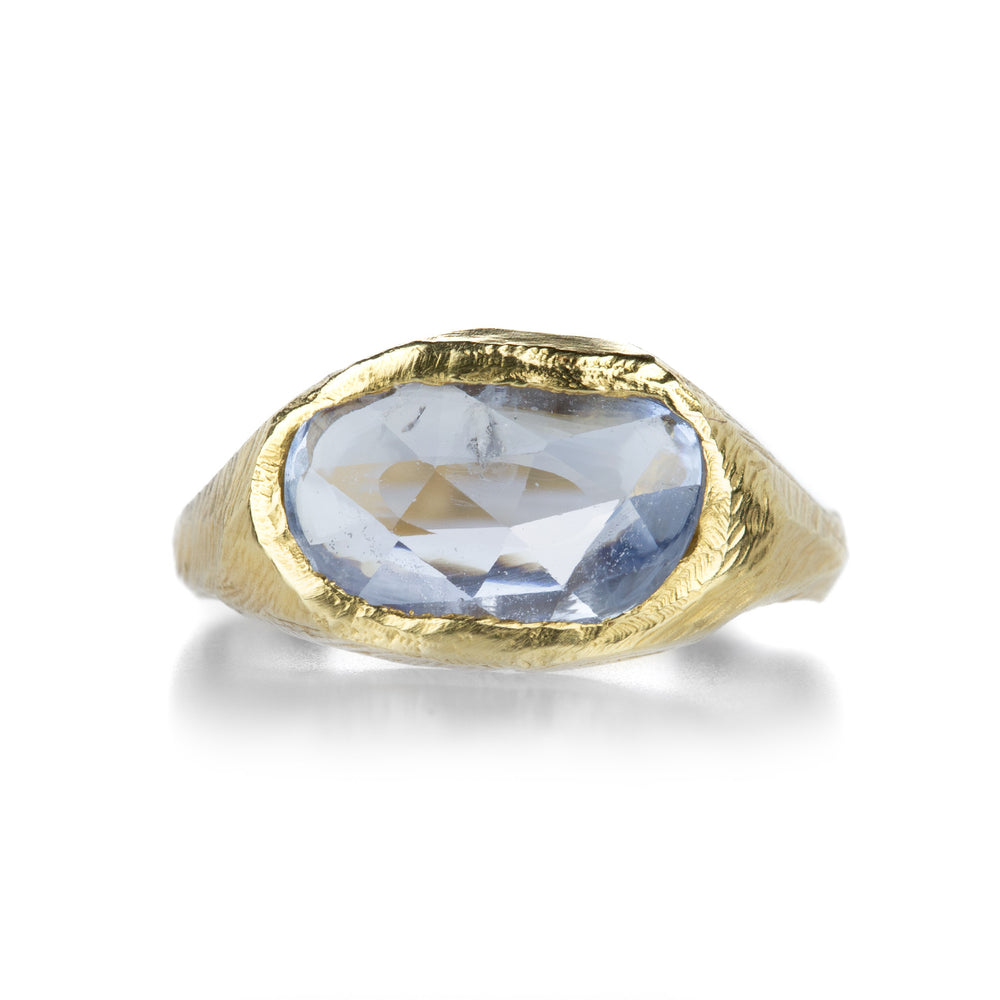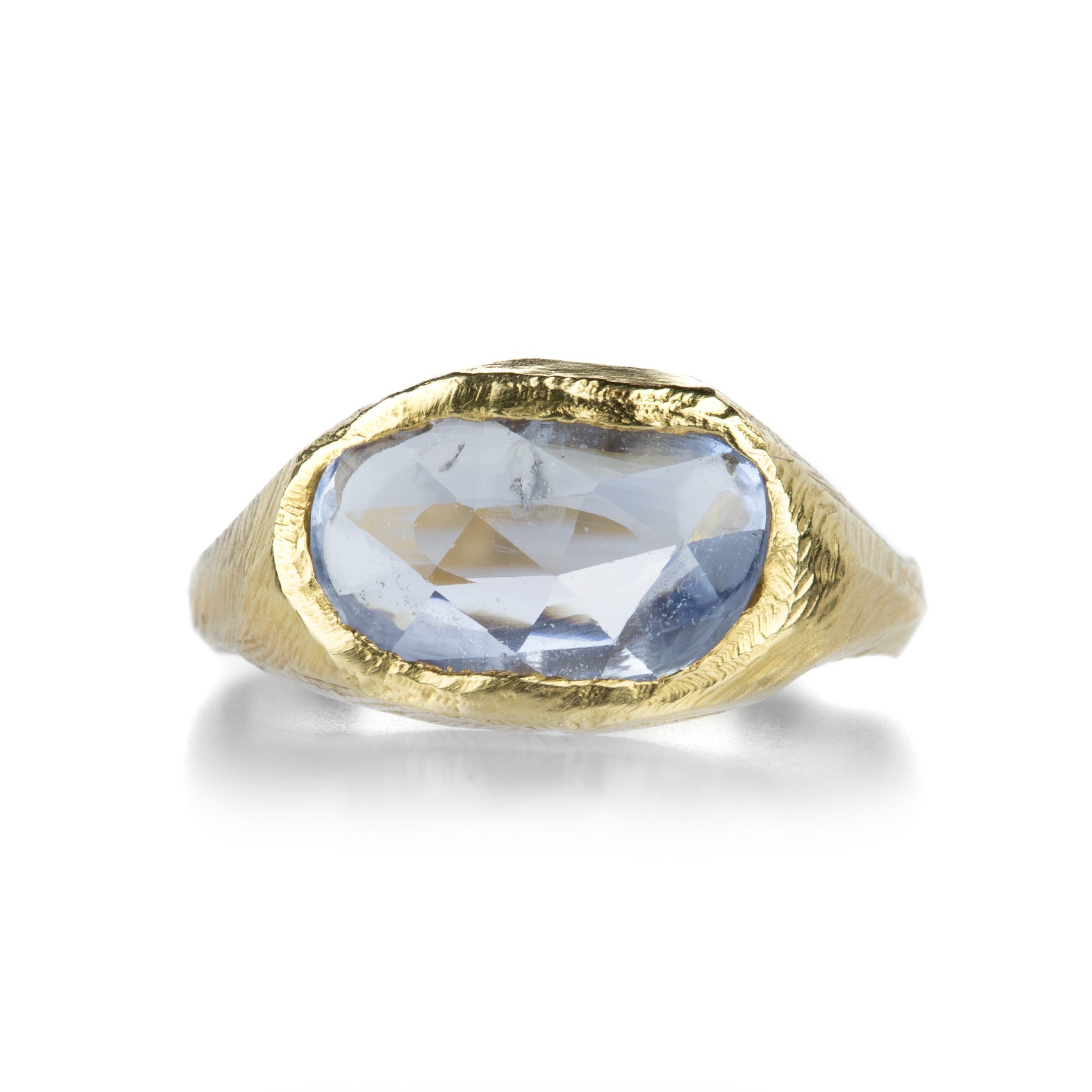 Impart your own personal meaning into this 18k yellow gold ring from Page Sargisson, featuring an organically shaped 1.50ct light blue sapphire signet. The hand carved and cast setting and band are enhanced with fabulous texture and a lovingly weathered feel. Stone measures 1/2" x 1/4". Size 5.5. Handcrafted in Brooklyn, NY, U.S.