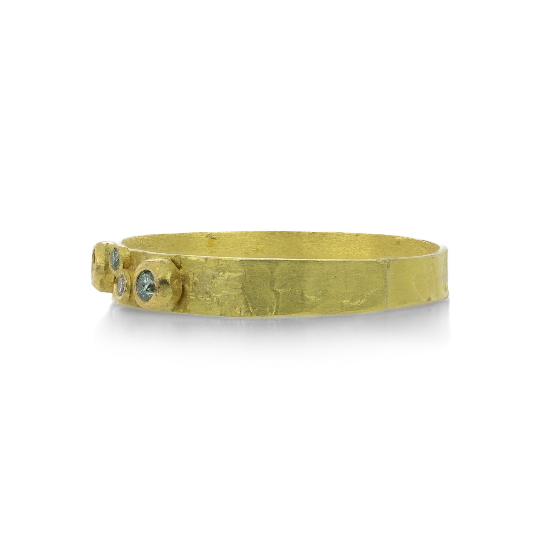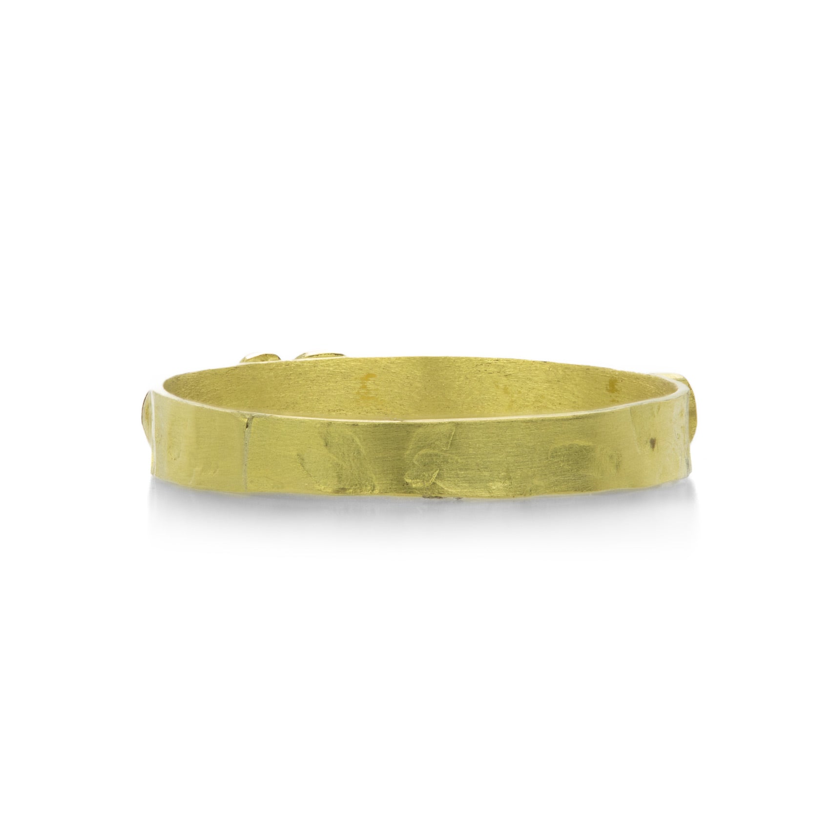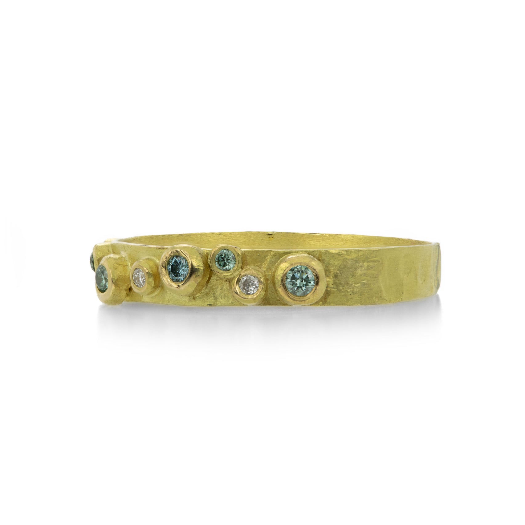 This fun, festive 18k yellow gold band from Lene Vibe will brighten any day! Multicolored diamonds totaling 0.14cttw are bezel set upon the hammered surface for a visual and textural delight! Band width measures 3.5mm. Size 8.75. Handcrafted in Denmark.