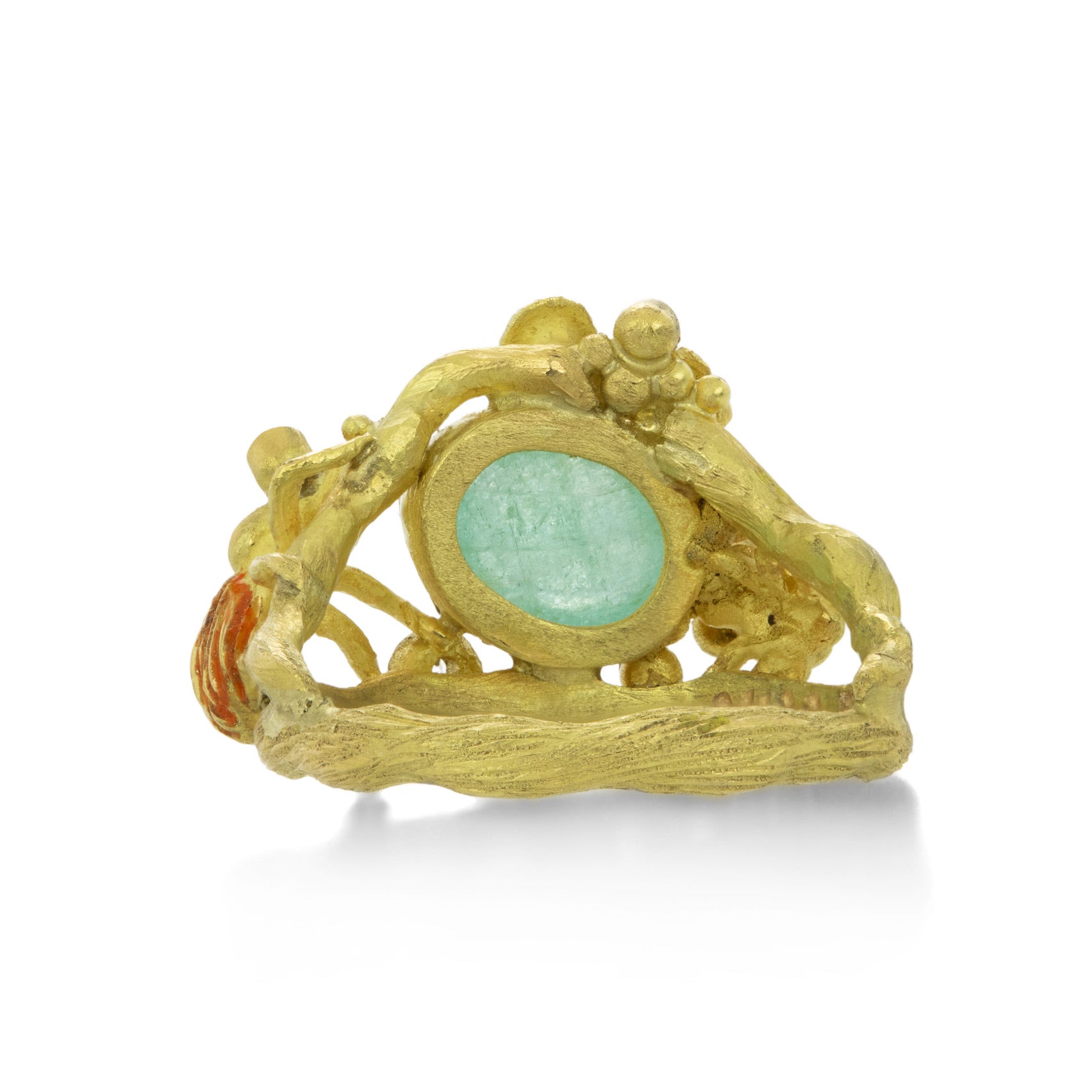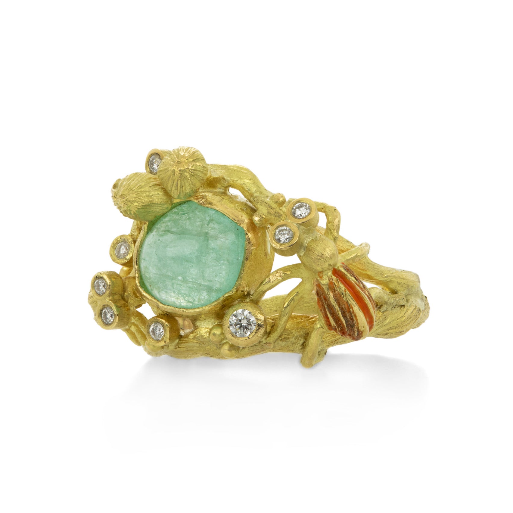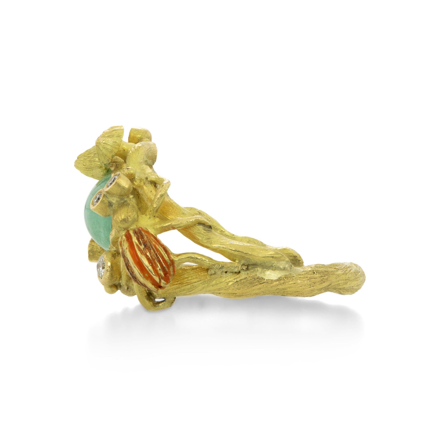 Get your garden goddess vibes on in this 18k yellow gold ring from Lene Vibe, featuring a 2.22ct oval Paraiba tourmaline cabochon as the star. Meticulously carved critters and shrooms sparkle with white diamonds totaling 0.10cttw in this whimsical piece. Size 6.75. Handcrafted in Denmark.
