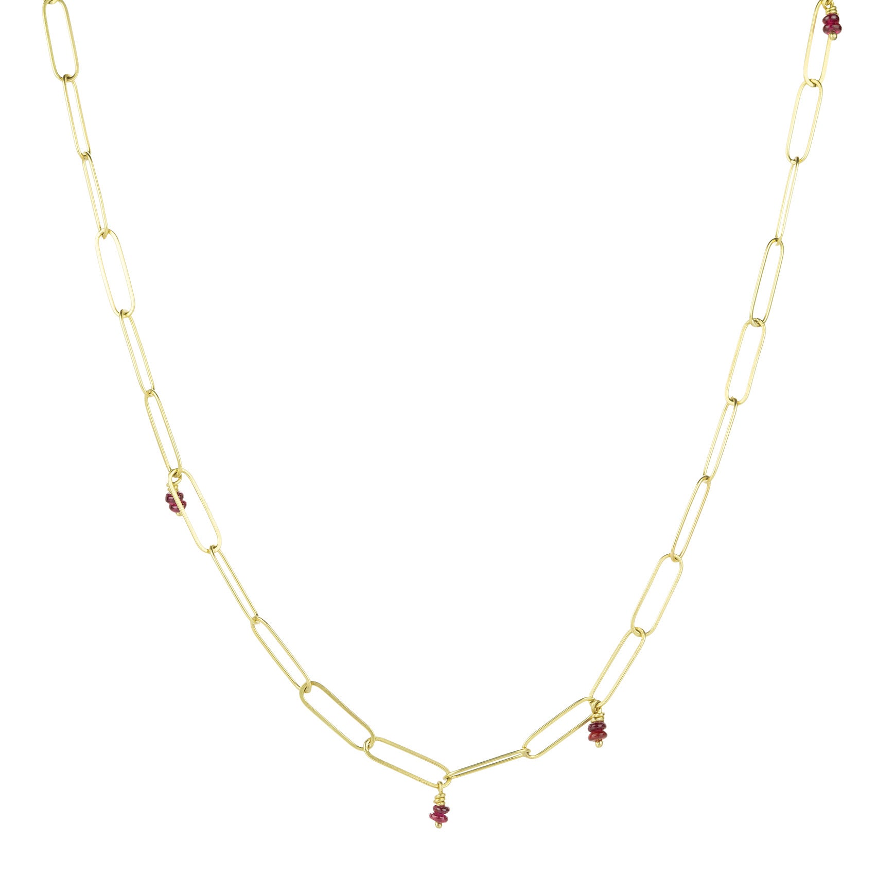 Layer on the links in this 18k yellow gold popsicle chain from Lene Vibe. Faceted ruby beads twinkle and chime at various hand formed links. Perfect for pendants, the total length with lobster clasp measures 18". Handcrafted in Denmark.