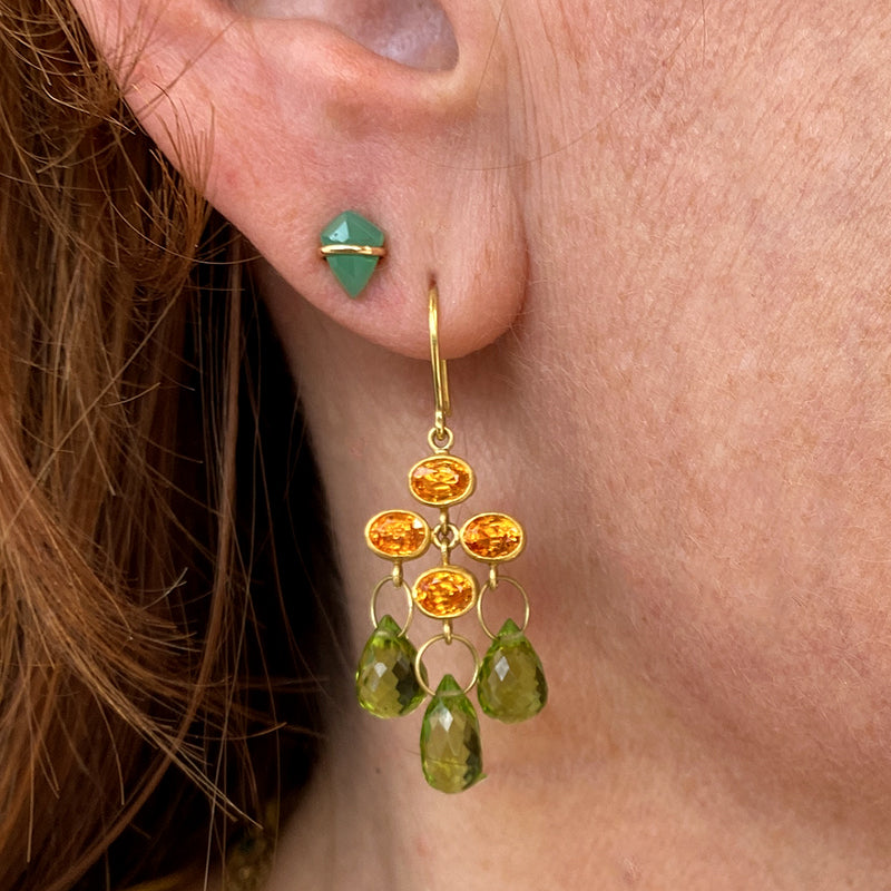 Get into the swing of things in a bright, colorful set of gemstone creations from Mallary Marks! This pair of 22k and 18k yellow gold earrings features clusters of bezel set orange sapphires totaling 2.92cttw, paired with pear shaped faceted peridot briolettes totaling 15.88cttw. Total length with curved ear wires measures 5/8". Handcrafted in New York, NY, U.S.