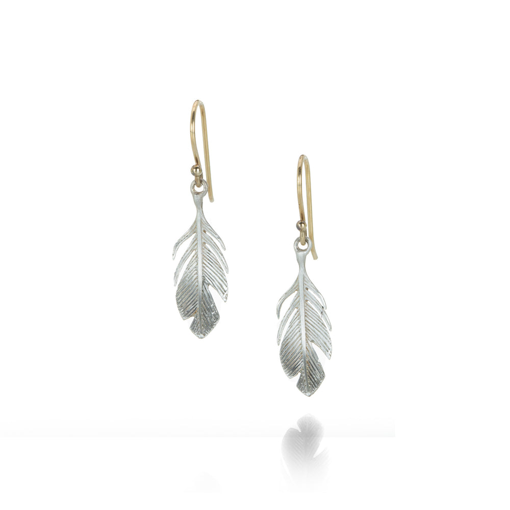 A pair of small, sterling silver feather drop earrings. Total length 1". Handcrafted in Hudson Valley, NY, U.S.