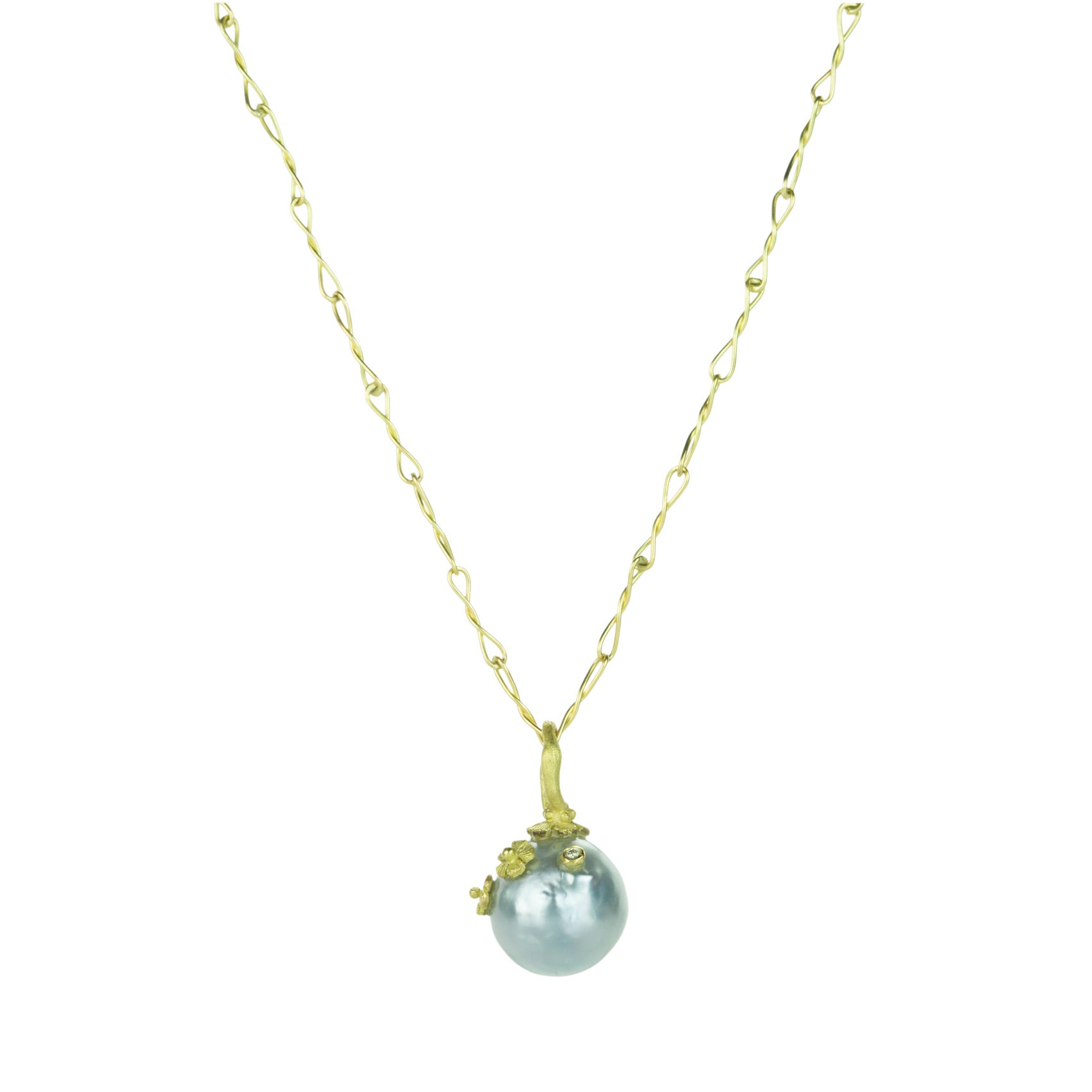 Little lights up a soul better than flowers and pearls. This 18k yellow gold pendant from Lene Vibe organically combines the two with a Tahitian pearl and two carved flowers with a bezel set 0.01ct white diamond. Total length measures 7/8“ including bail. Pendant only, chain is sold separately. Handcrafted in Denmark.