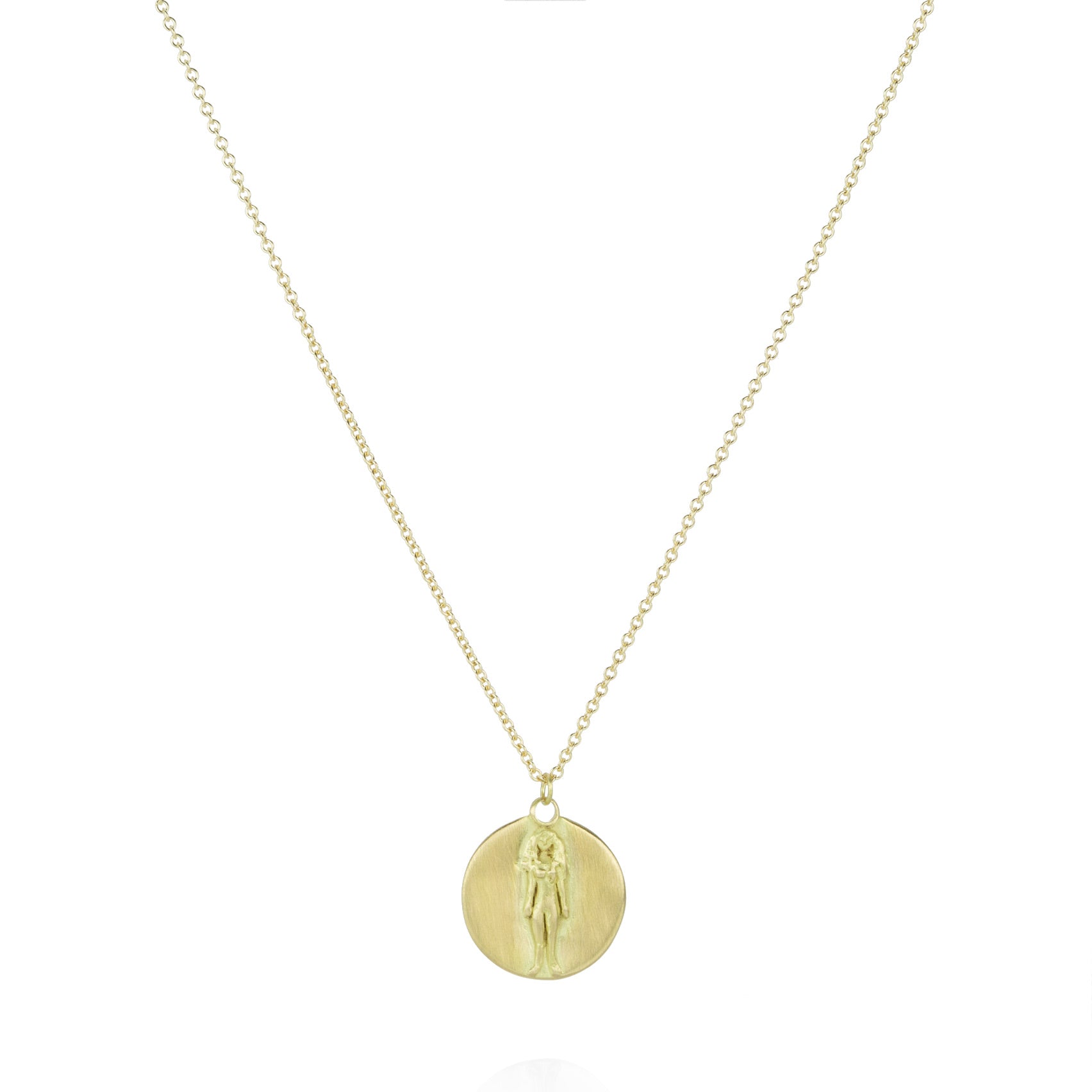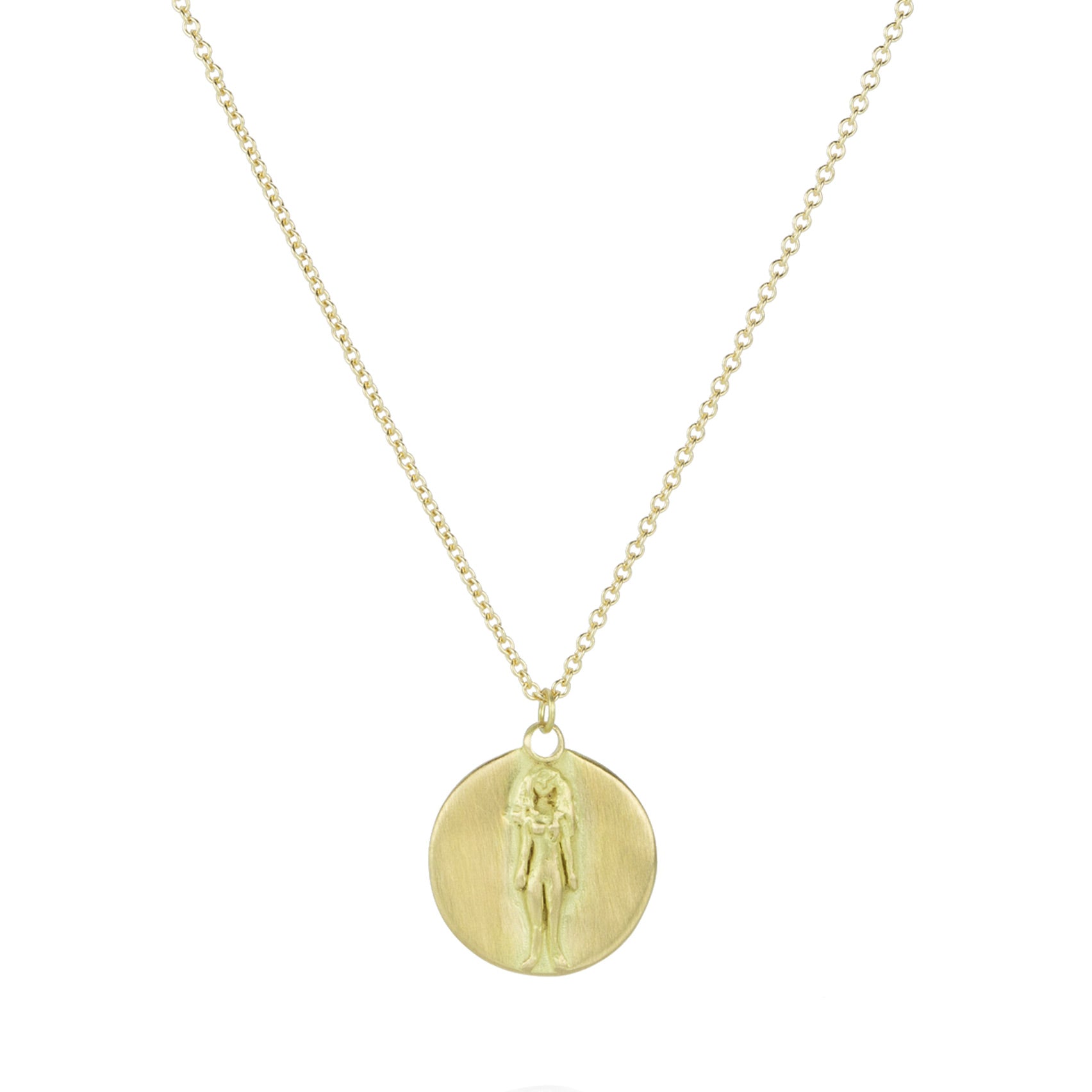 Calling all Virgoans! This 18k yellow gold necklace from Marian Maurer celebrates you with a round, brushed, hand carved Virgo pendant. Ruled by Mercury and the element of earth, those born under this sign are graceful, loyal, organized and analytical. Pendant measures approximately 1/2" in diameter on a 16" chain. Handcrafted in Brooklyn, NY, U.S.