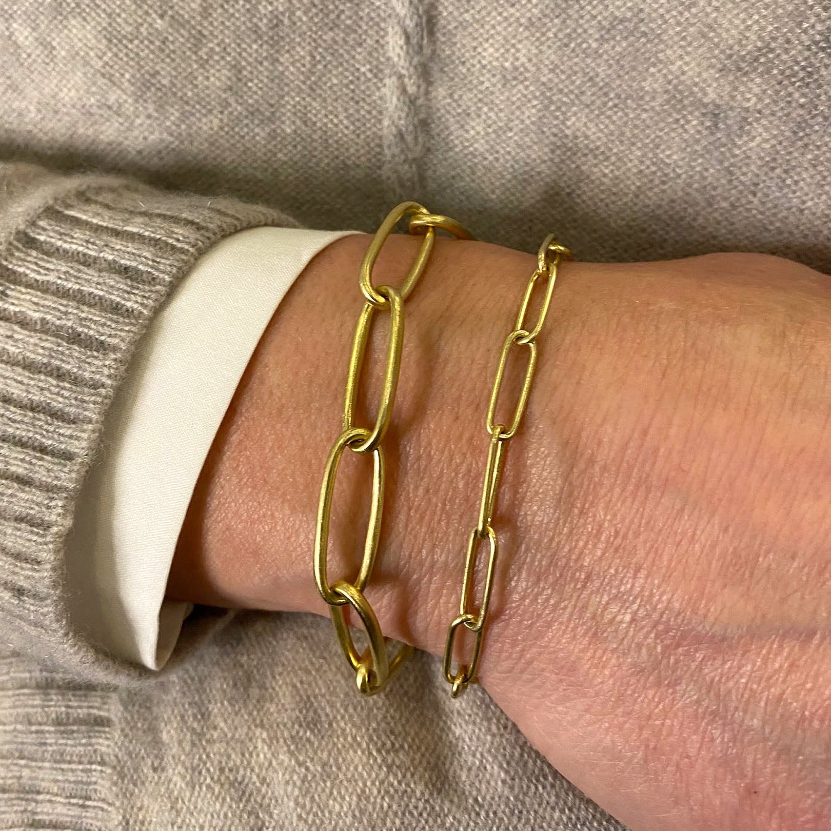 This highly coveted handmade chain from Maria Beaulieu has been measured to bracelet length, a perfect companion to one of the artist’s necklaces and one of a kind pendants. Crafted in 18k yellow gold, this ultra heavyweight chain bracelet is strong, organic and luxurious. Treat yourself! Total length with cleverly hidden closure measures 7 1/2”. Handcrafted in Brooklyn, NY, U.S.