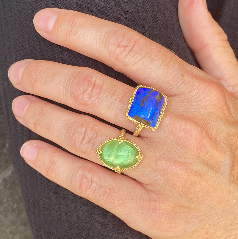 Dive into the deep blue bliss in this 18k yellow gold ring from Amali, featuring an organically rectangular 12.26ct boulder opal. This magnificent treasure from the earth has a high profile with a wonderful raw edge. Opal measures just over 1/2” x 3/4" including bezel. Size 6.75. Handcrafted in New York, NY, U.S.