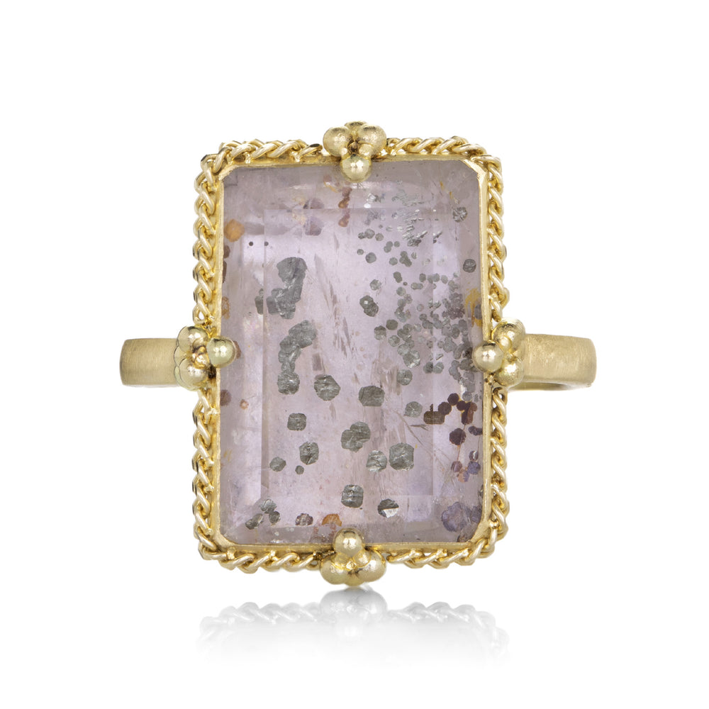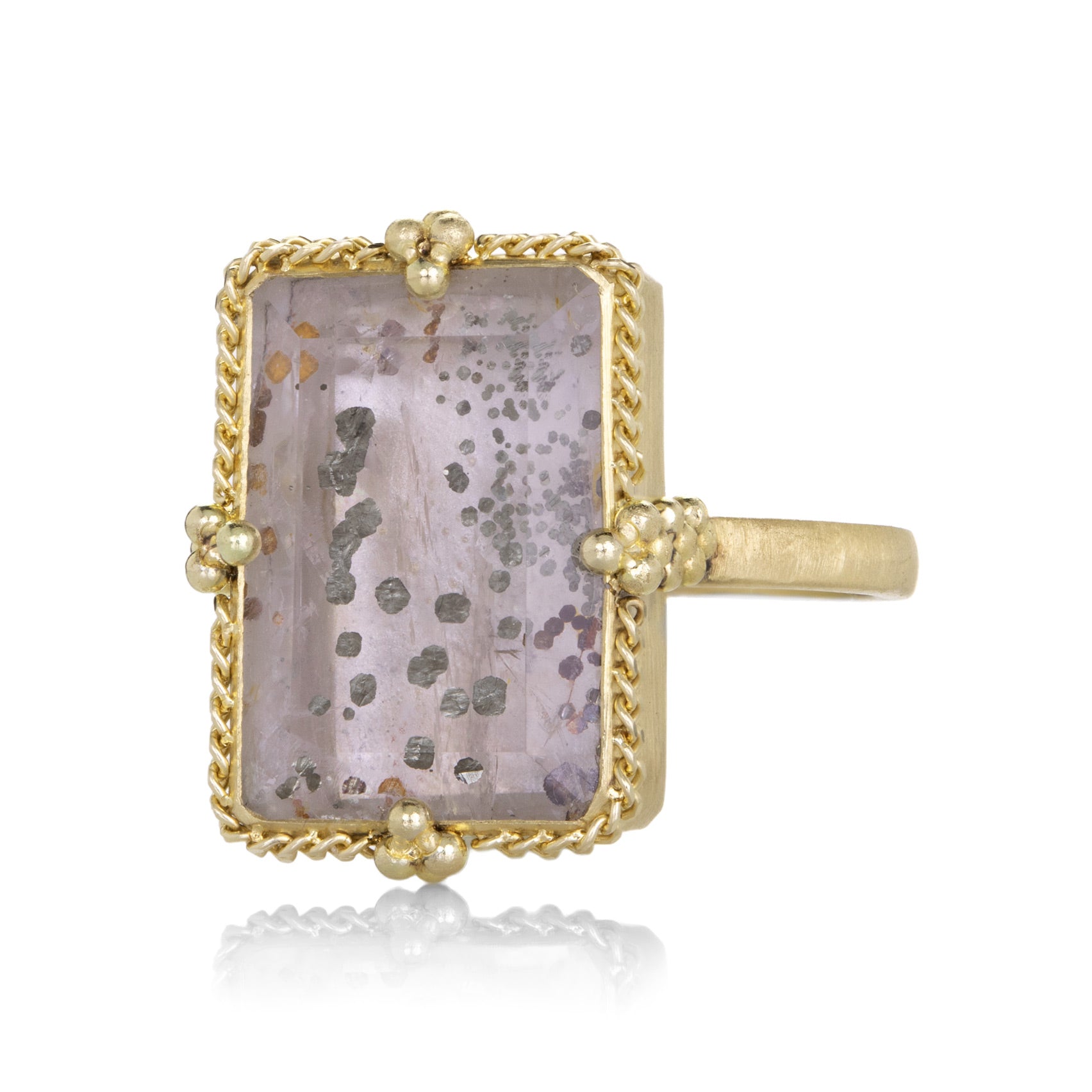 A true one of a kind, this 18k yellow gold ring from Amali starts the conversation! A large 10.42ct quartz with dazzling pyrite inclusions is set in a chain and granulation detailed bezel. Stare into this piece’s starry depths and get inspired! Stone measures 1/2" x 3/4". Size 6.75. Handcrafted in New York, NY, U.S.