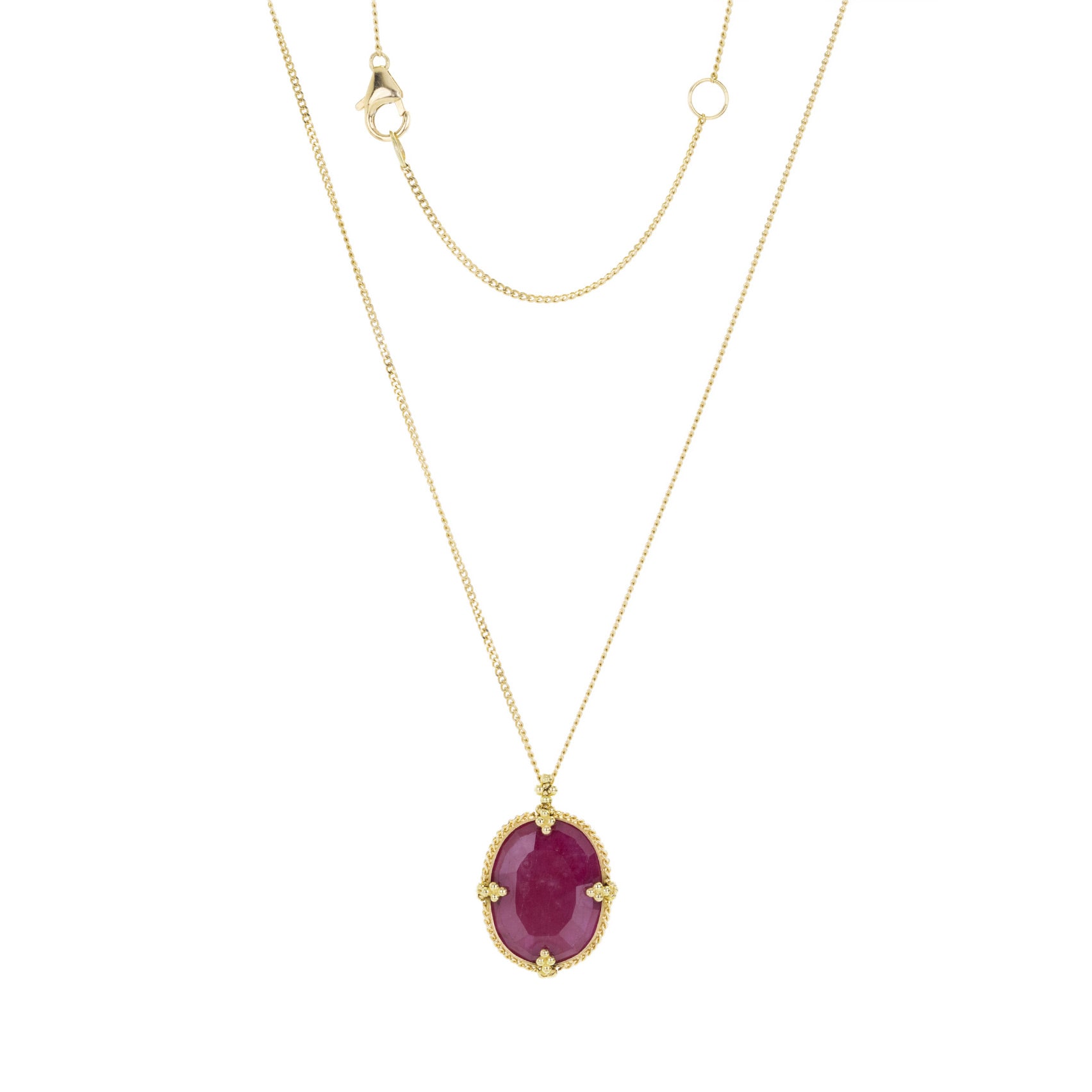 Spread some love in this 18k yellow gold necklace from Amali, featuring a 7.60ct oval shaped ruby. The faceted stone beams with positivity, and is set off by intricate chain and granulation detail along the bezel. Pendant measures 7/8" including bail. Total necklace length measures 16”-18” with lobster clasp. Handcrafted in New York, NY, U.S.