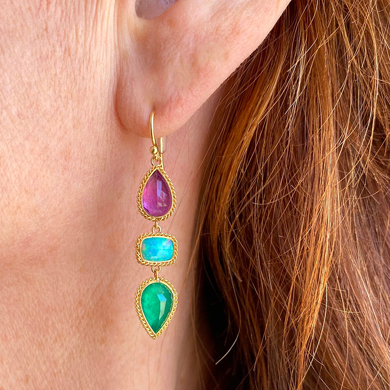 Emerald, Fluorite and Ethiopian Opal Drop Earrings