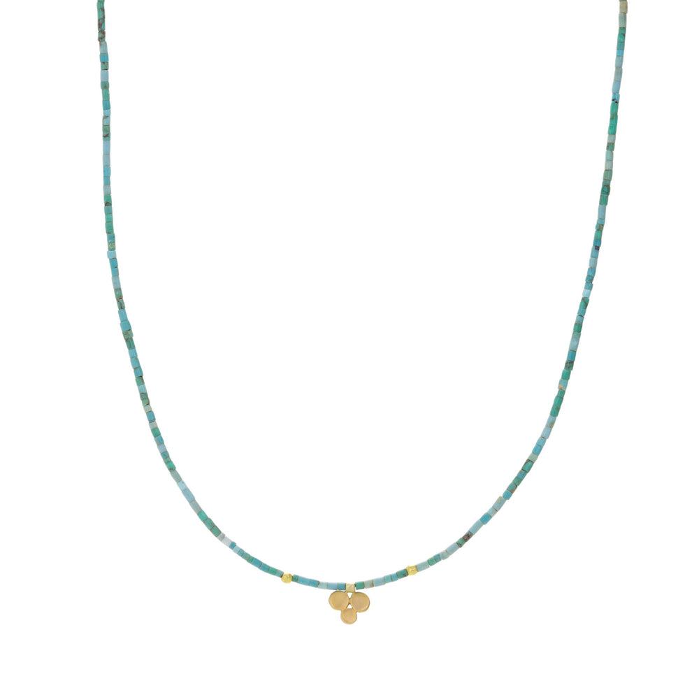 The perfect piece for layering or adding a delicate splash of color, this heishi turquoise beaded necklace from Ananda Khalsa features a center section with a 22k triple dot charm. Total length with lobster clasp measures 16". Handcrafted in Northampton, MA, U.S.