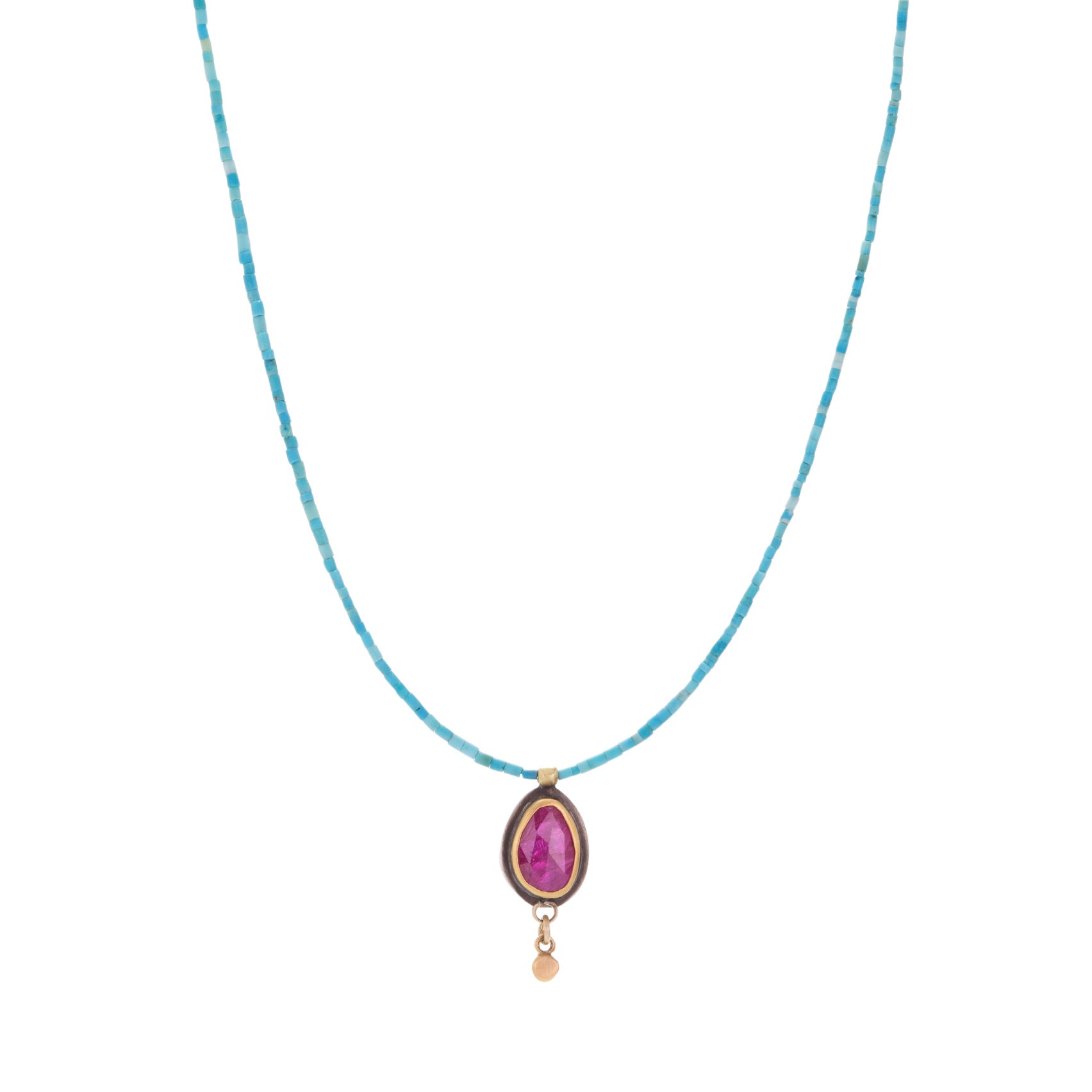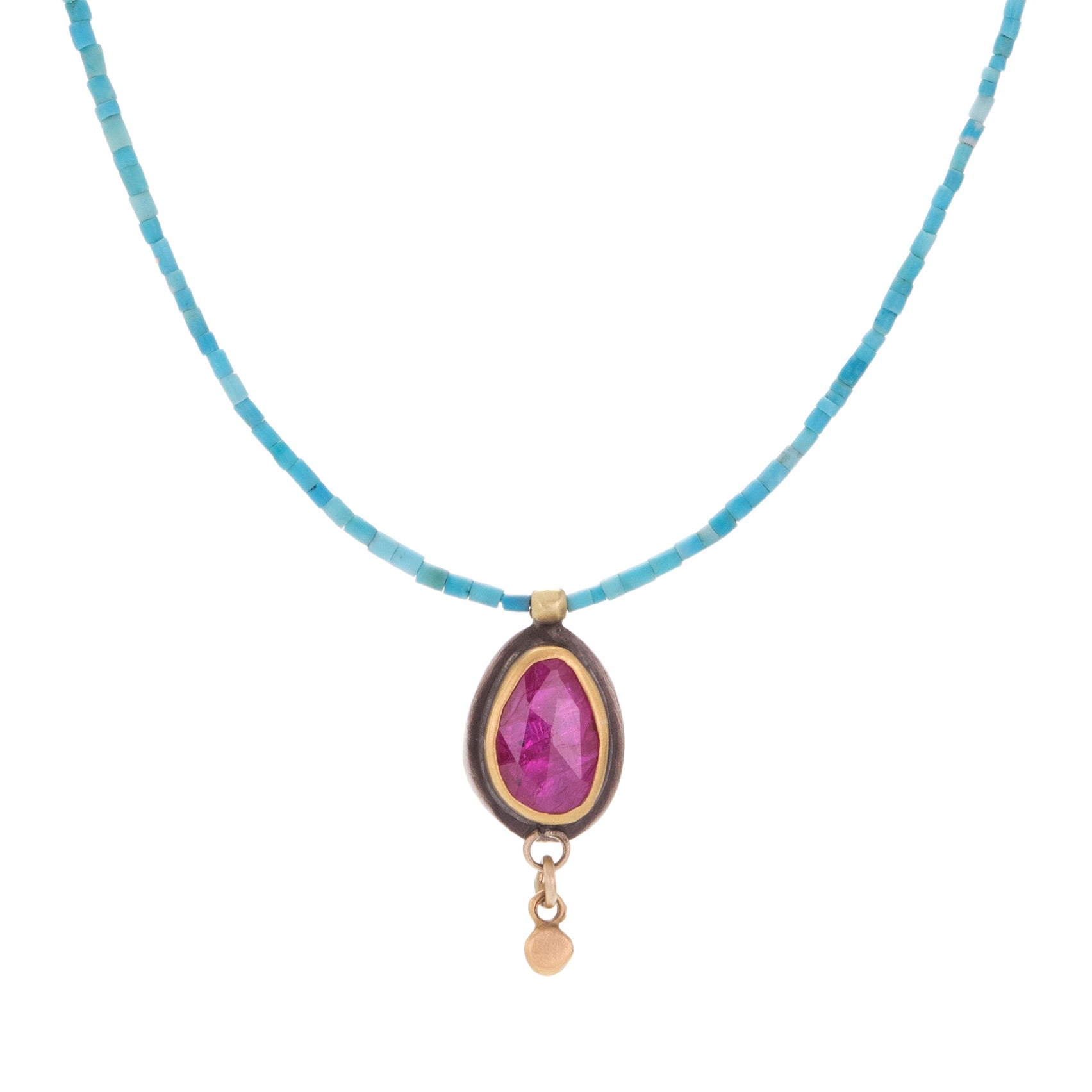 Bring a healthy dose of gemstone love into your look with this beaded turquoise necklace from Ananda Khalsa! A sterling silver pendant holds a rose cut ruby, set in a warm 22k yellow gold bezel. Pendant length measures 5/8". Total length with 14k yellow gold lobster clasp measures 16". Handcrafted in Northampton, MA, U.S.