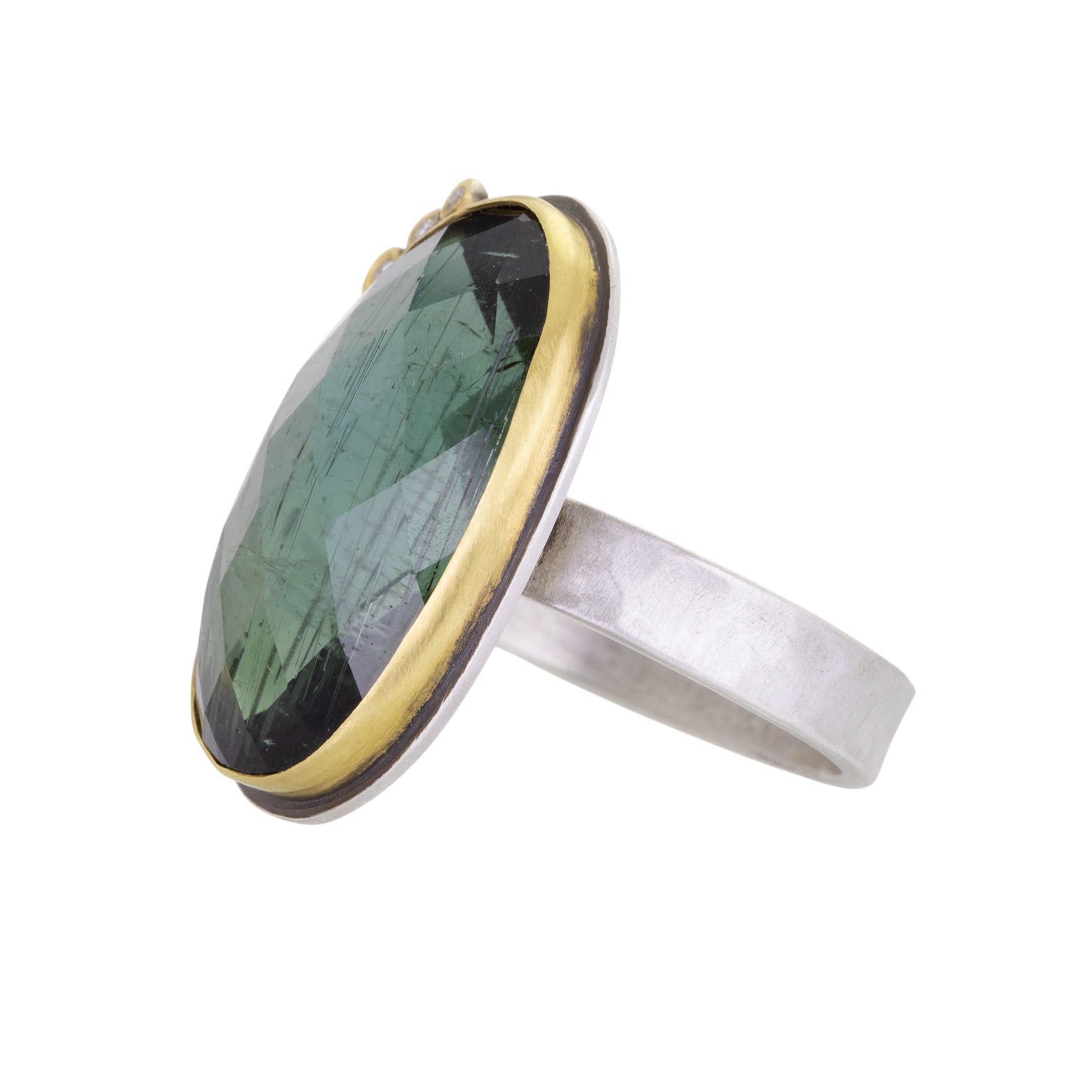 Put on a piece of pure artisan luxury and celebrate your love for color and sparkle! This statement making sterling silver ring from Ananda Khalsa features a stunning rose cut green tourmaline set in a 22k yellow gold bezel. Five bezel set satellite diamonds add a splash of fire. Stone measures 7/8" x 5/8". Size 7.5. Handcrafted in Northampton, MA, U.S.
