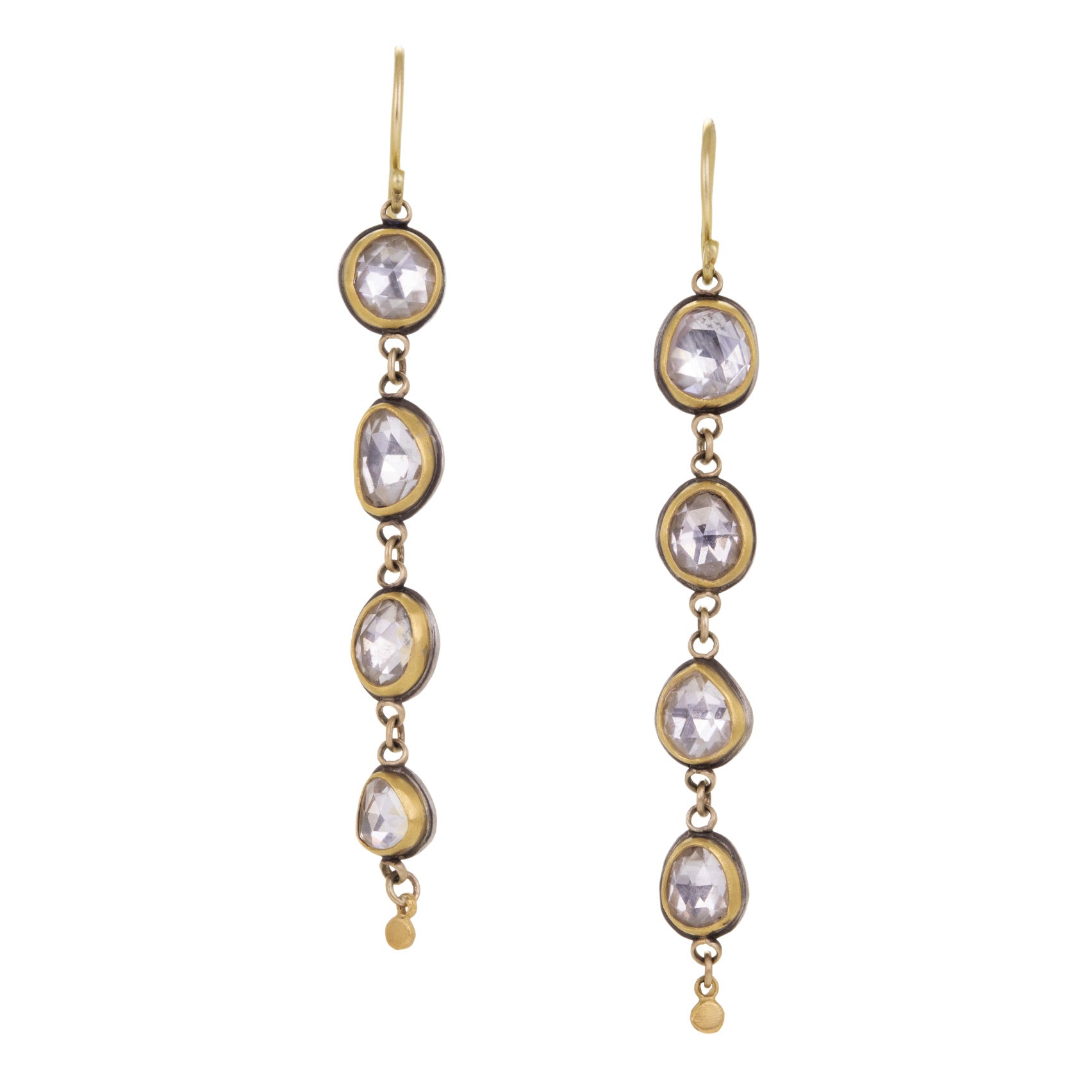 Wash yourself in waterfalls of dazzling sparkle in this pair of sterling silver and 22k yellow gold earrings from Ananda Khalsa. Rose cut organically shaped zircons are snug bezel set and linked with flat dot accents dangling below. Total length with 18k yellow gold ear wires measures just over 2". Handcrafted in Northampton, MA, U.S.