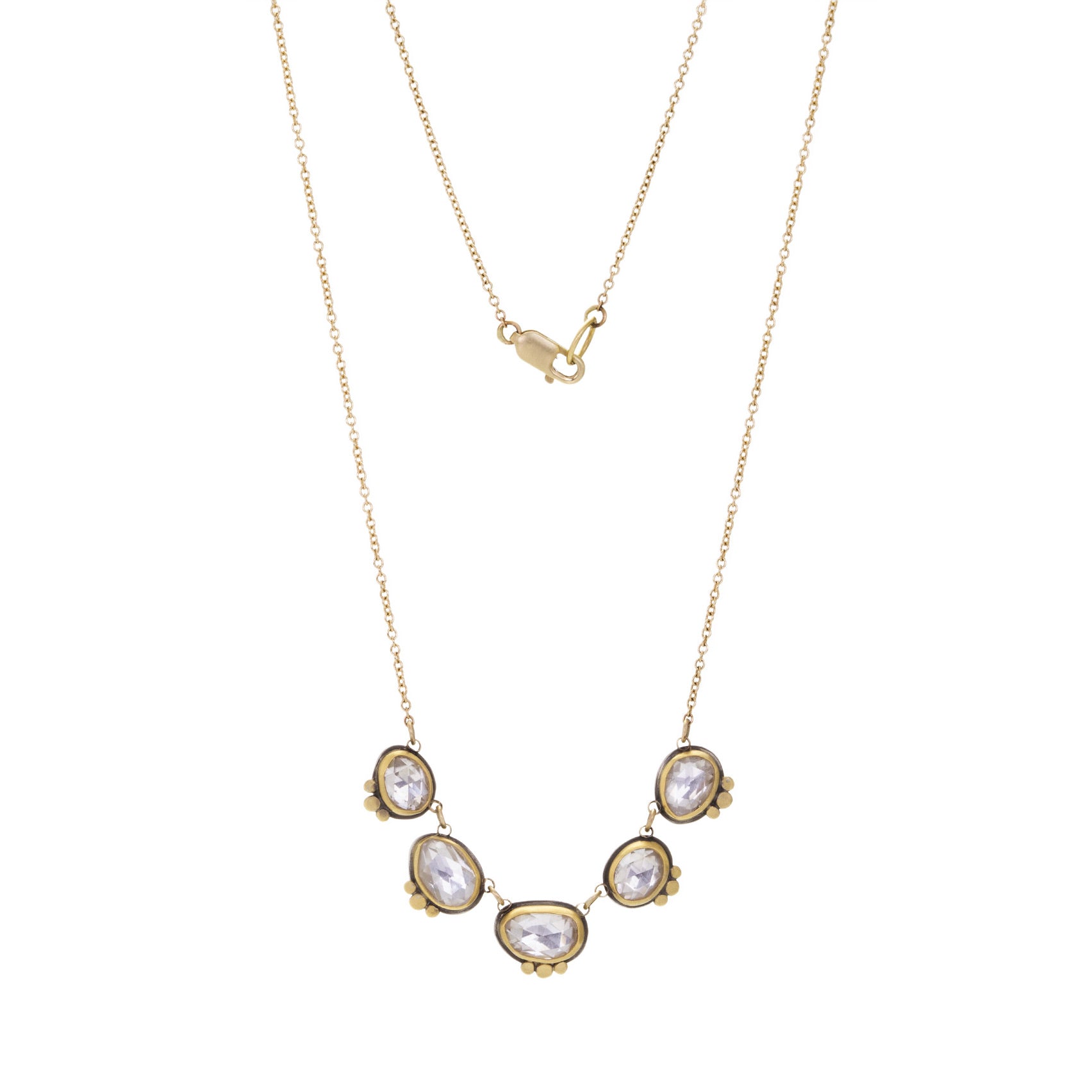 Wake up to an ethereal dream in this sensual necklace from Ananda Khalsa. An 18k yellow gold chain holds five subtly graduated rose cut zircons in sterling silver and 22k yellow gold bezels. Flat circle accents bring the piece together. Total length with lobster clasp measures 16". Handcrafted in Northampton, MA, U.S.