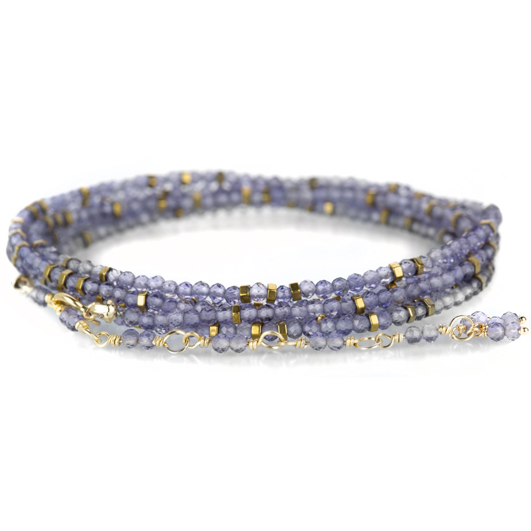 Proclaim your original sense of style with an Anne Sportun wrap bracelet! Brilliantly layered with gold pyrite beads sprinkled throughout, this faceted iolite wrap bracelet adds five rows of sparkling color to your wrist stack. A truly versatile piece, it can also be worn as a long necklace or wrapped around twice for a shorter, layered look. Bracelet measures up to 34" with a 14k yellow gold wire wrapped 2" extension and spring ring clasp. Handcrafted in Toronto, ON, Canada.