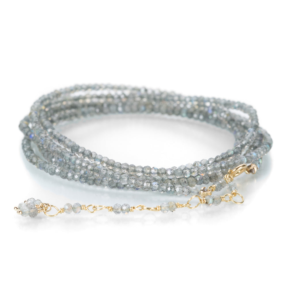 Proclaim your original sense of style with an Anne Sportun wrap bracelet! Brilliantly accented with an 18k gold hex bead, this faceted labradorite bracelet adds five rows of sparkling color to your wrist stack. A truly versatile piece, it can also be worn as a long necklace, or wrapped around twice for a shorter, layered look. Bracelet measures up to 34" with a 14k yellow gold wire wrapped 2" extension and spring ring clasp. Handcrafted in Toronto, ON, Canada.
