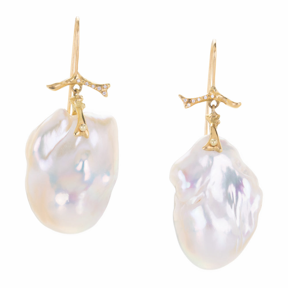 A stunning interpretation of two of nature’s most beautiful materials, this pair of 18k yellow gold earrings from Annette Ferdinandsen features beautiful white baroque pearl drops. Silky and luxurious, these romantic beauties will add a bold dash of glow to your look. Total length with curved diamond branch ear wires measures 1 3/4“. Handcrafted in Hudson Valley, NY, U.S.