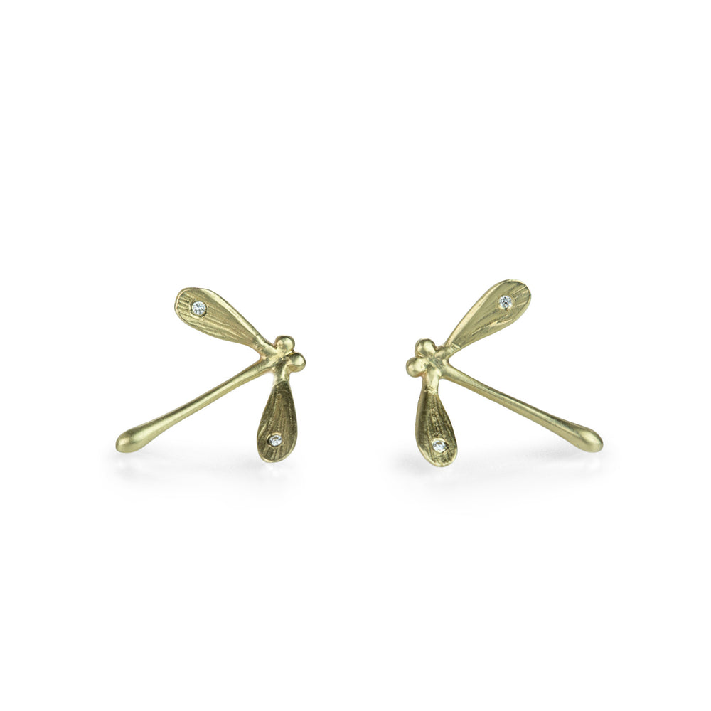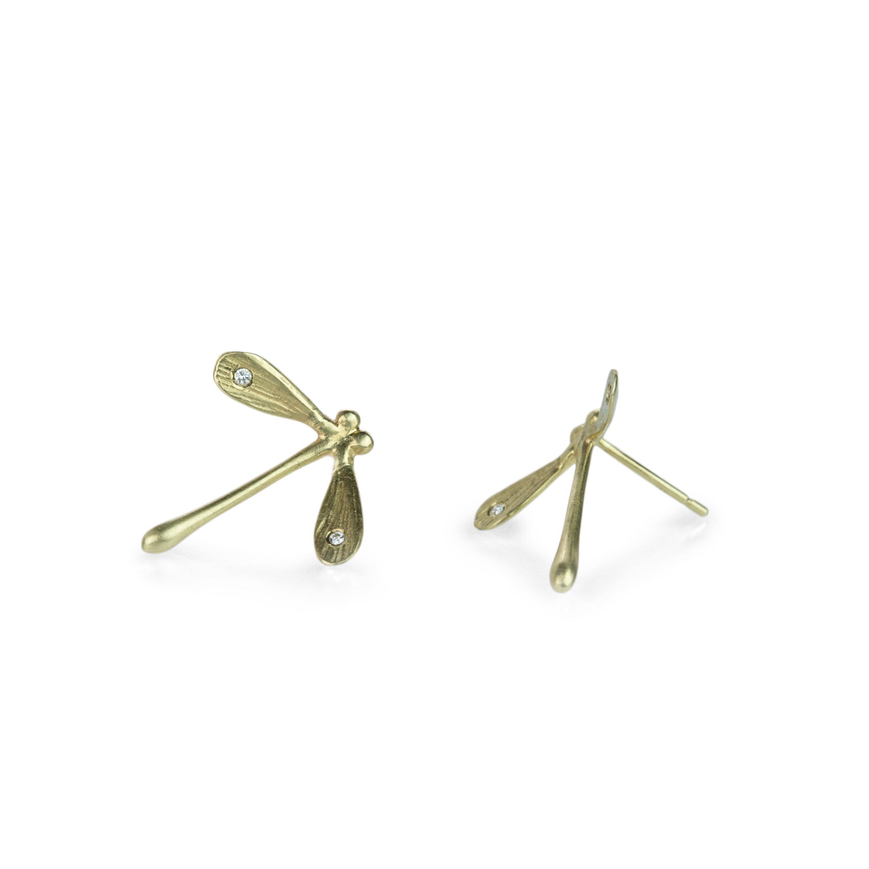 The delicate, diamond winged damselfly sits gently upon the ear in this pair of 14k yellow gold studs from Annette Ferdinandsen. Flies measure 3/4" x 5/8". Handcrafted in Hudson Valley, NY, U.S.