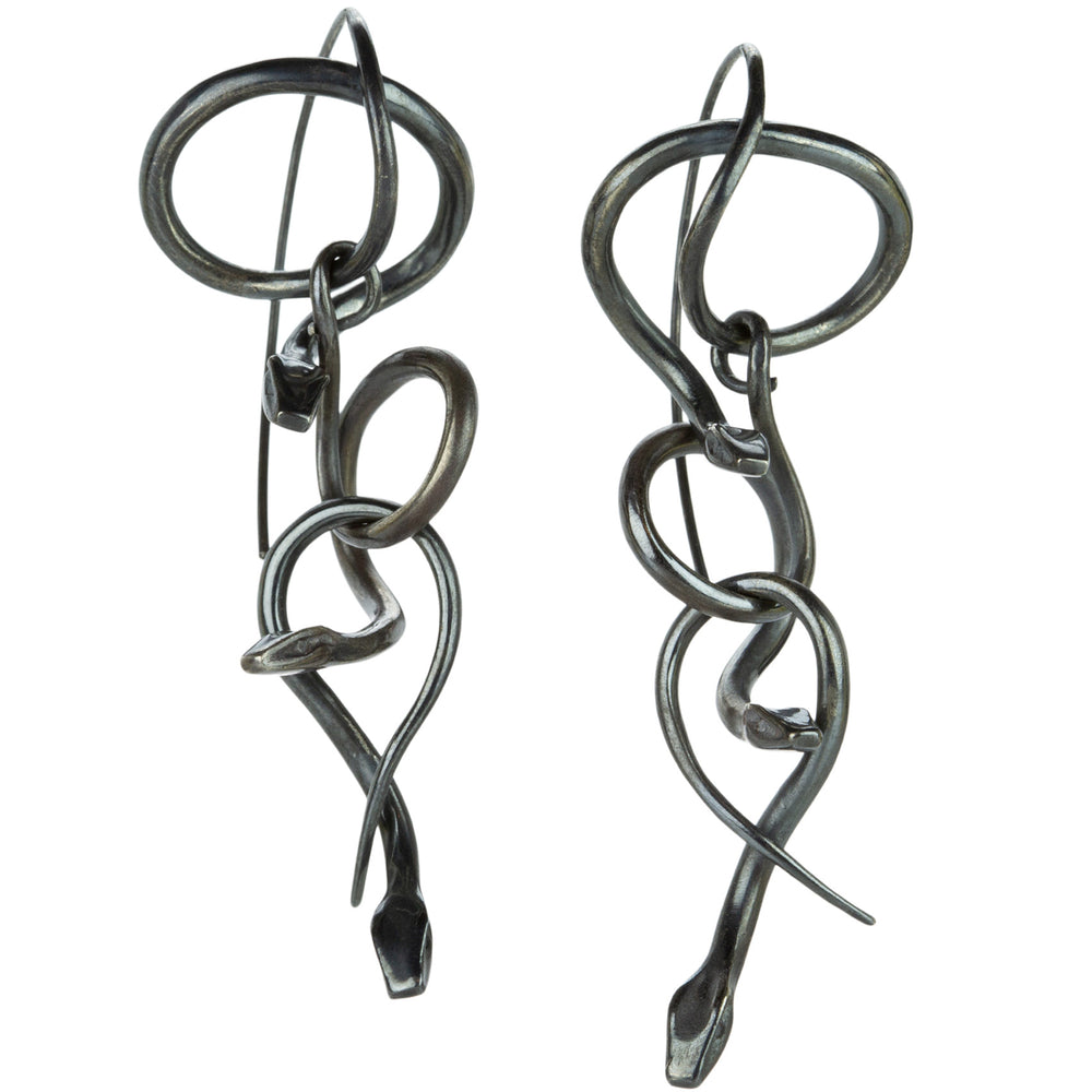 A tangle of serpentine splendor delights the wearer of these Annette Ferdinandsen oxidized sterling silver chandelier earrings. Daringly sleek, a trio of snakes combine for an impressive display of motion and imagery. Total length measures 2 1/2". Handcrafted in Hudson Valley, NY, U.S.