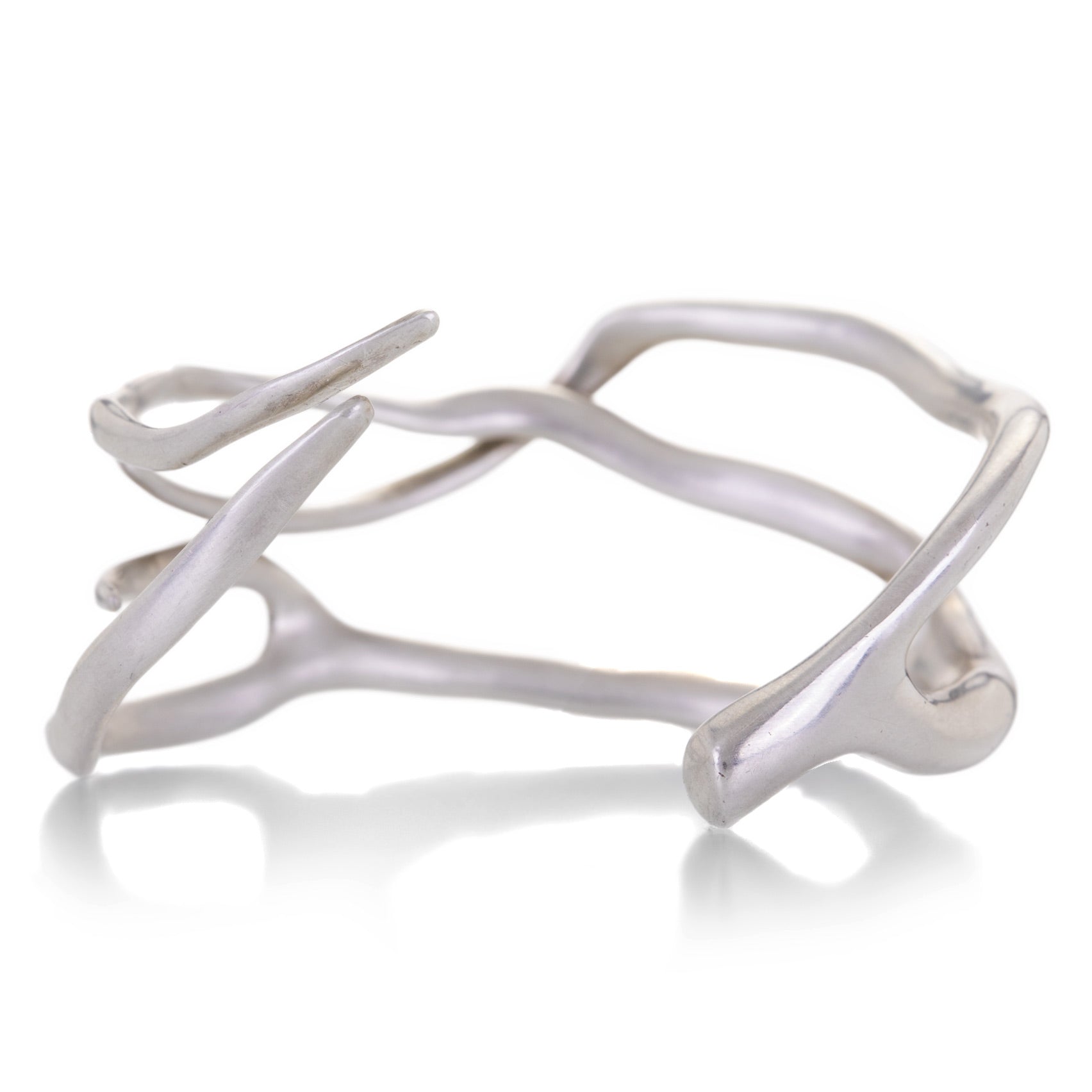 A sterling silver coral branch cuff. Inner diameter measures 2 1/4" x 1 3/4". Handcrafted in Hudson Valley, NY, U.S.