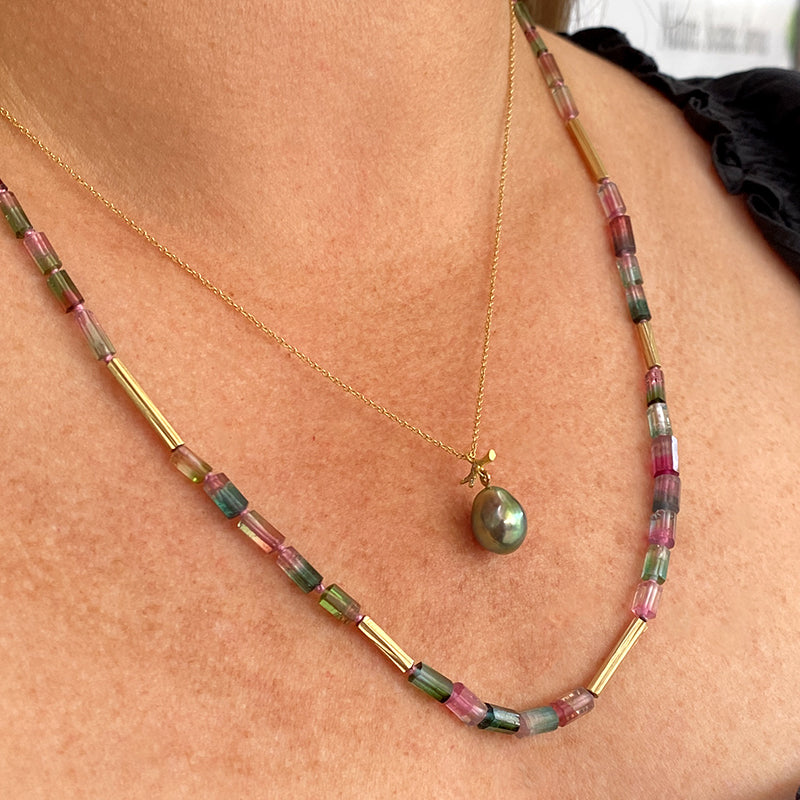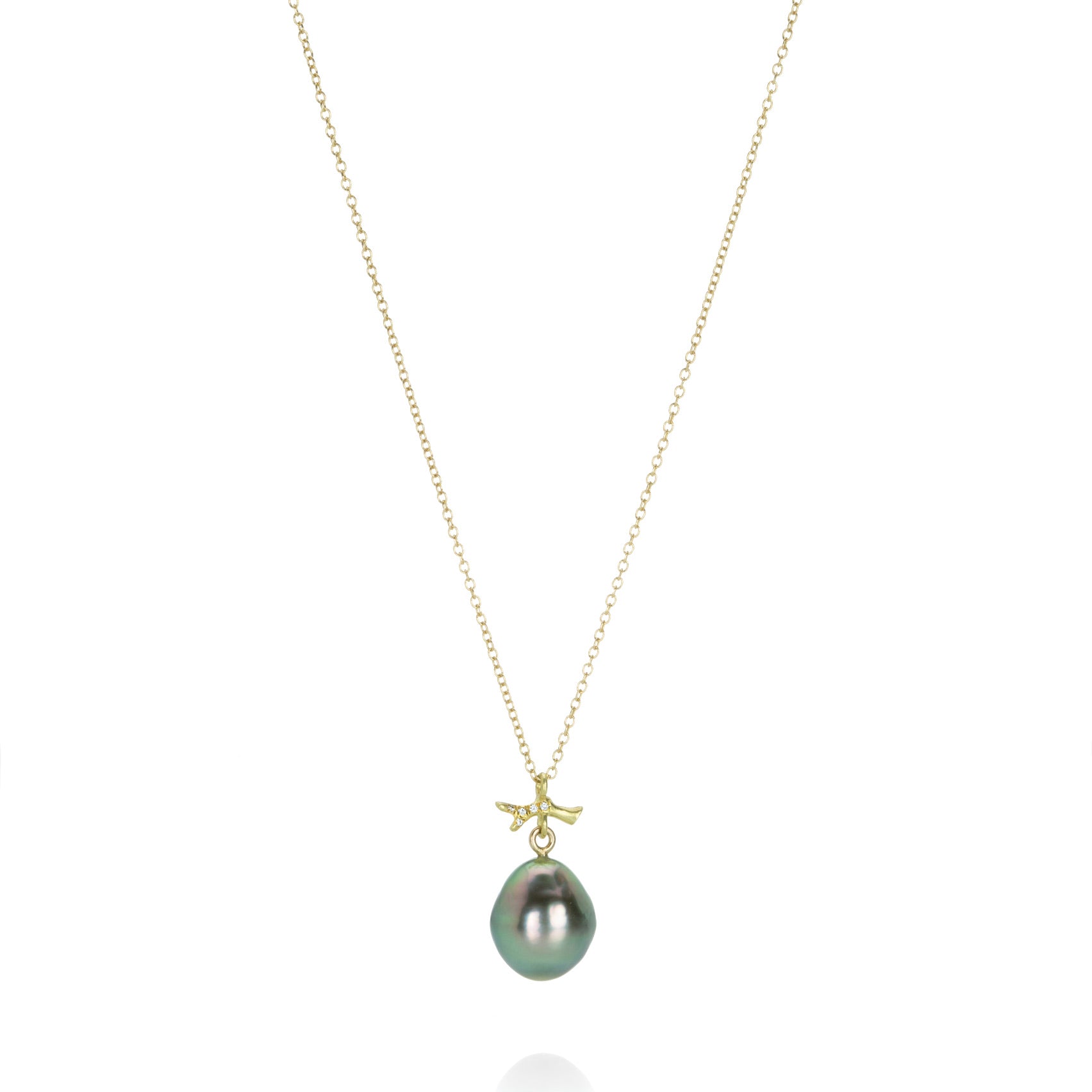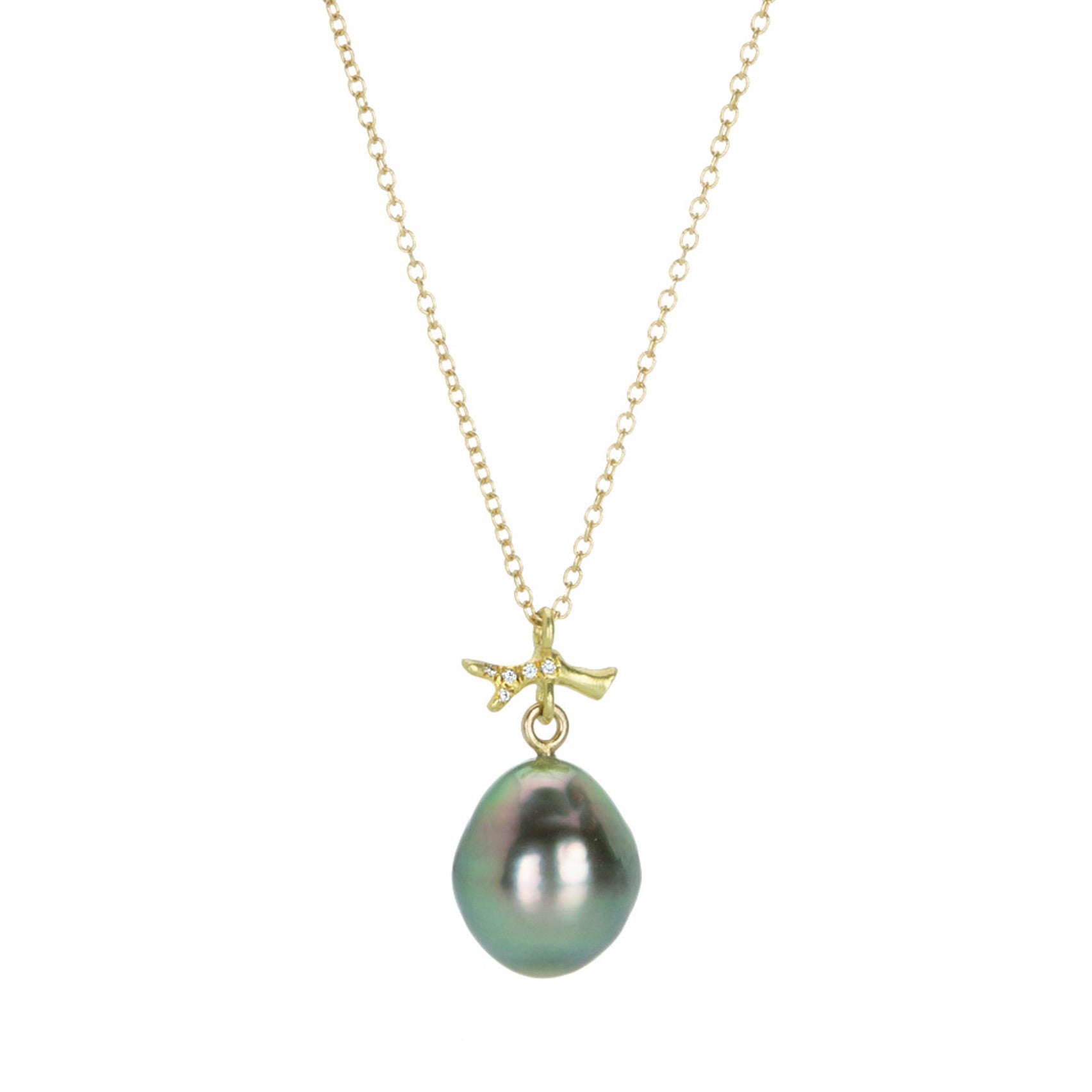 This classic, yet artistically designed 18k yellow gold necklace from Annette Ferdinandsen features a brilliant gray Tahitian pearl pendant hanging from a sparkling pavé diamond twig. Pendant measures about 3/4" in length. Total length measures 18". Handcrafted in Hudson Valley, NY, U.S.
