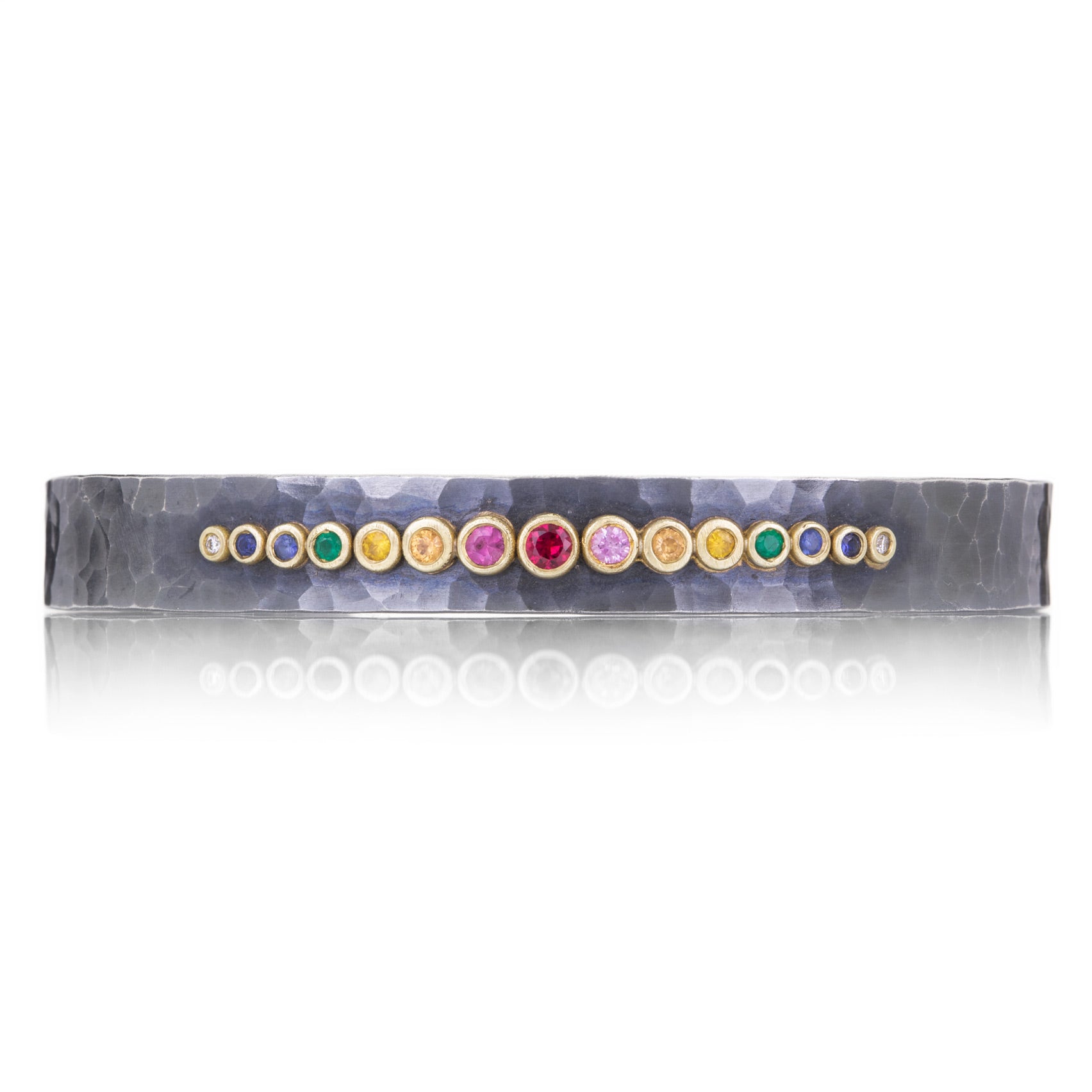 Celebrate life in all the colors of the rainbow in this Annie Fensterstock cuff! The hand fabricated hammered cuff is crafted in oxidized sterling silver and 22k yellow gold with emeralds, rubies and multicolored sapphires. Inner diameter measures 2 3/8" x 1 3/4". Handcrafted in New York, NY, U.S.