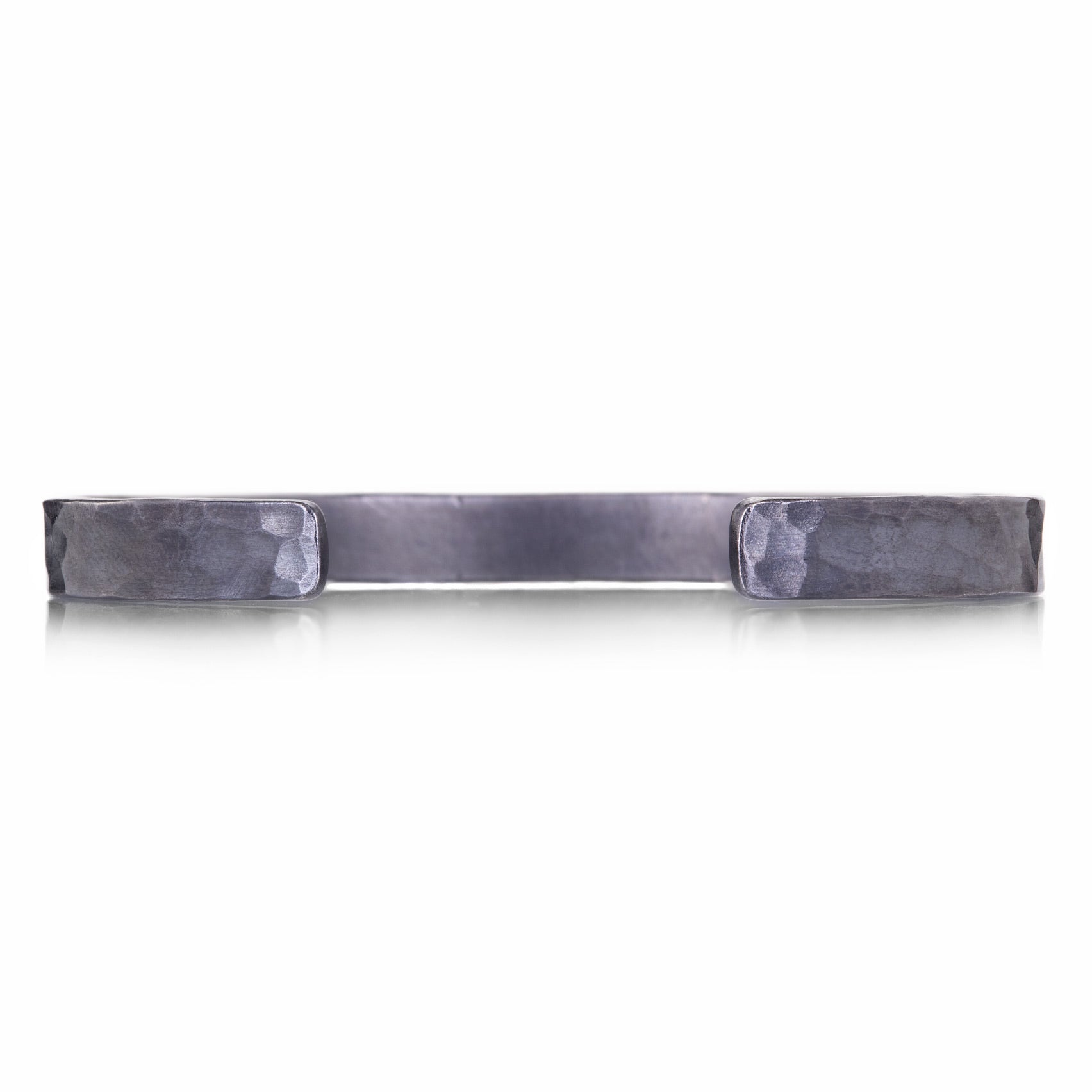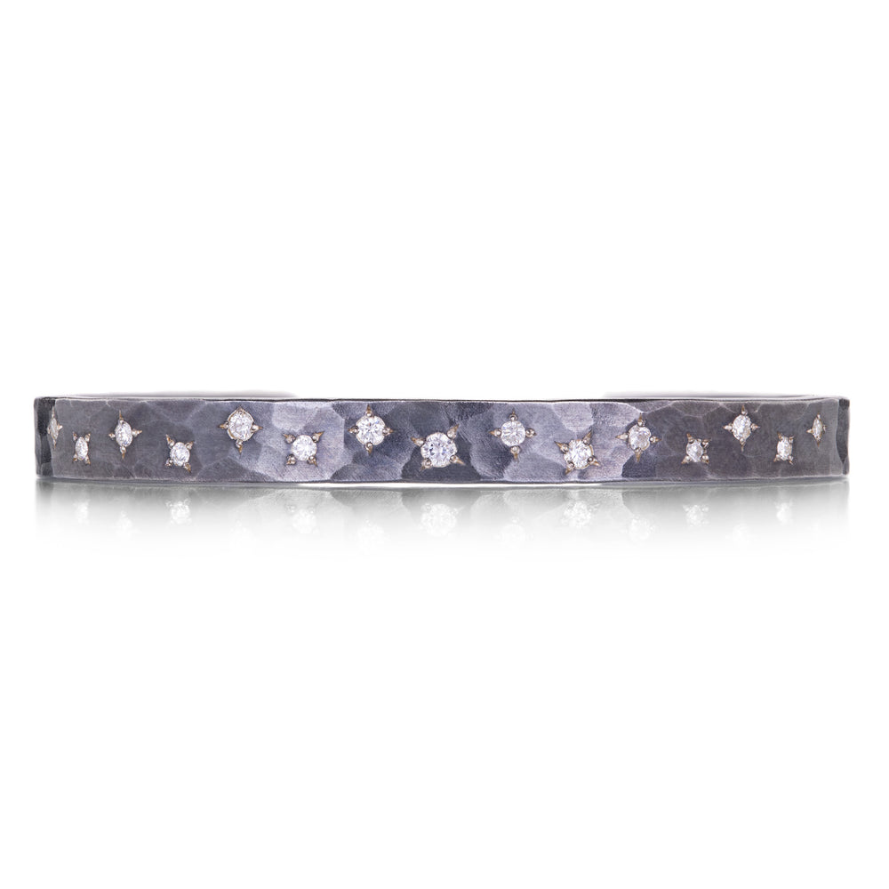 Cuff yourself in the modern, minimalist look of this star-crossed piece from Annie Fensterstock. Hand fabricated in blackened sterling silver, the hammered surface features dancing white diamonds of various sizes totaling 0.37cttw. Band width measures 6mm. Inner diameter measures 2 1/4". Handcrafted in New York, NY, U.S.
