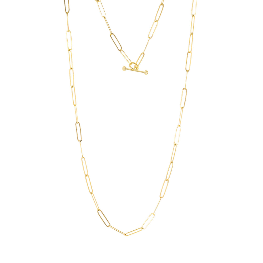 Perfect for layering or holding a treasured locket or pendant, this 22k gold oval link paperclip chain from Annie Fensterstock simply drips of handmade quality and love. Total length measures 18” with toggle clasp. Handcrafted in New York, NY, U.S.