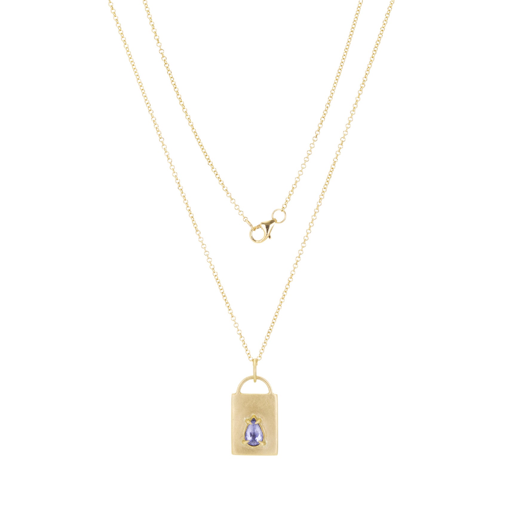 Hold what’s dear to you near to you in this 18k yellow gold cable chain necklace from Annie Fensterstock. A pear shaped, 0.40ct blue sapphire gleams from a pronged setting atop a brushed padlock shaped charm. Pendant measures 7/8" x 3/8". Total length measures 18" with a lobster clasp. Handcrafted in New York, NY, U.S.