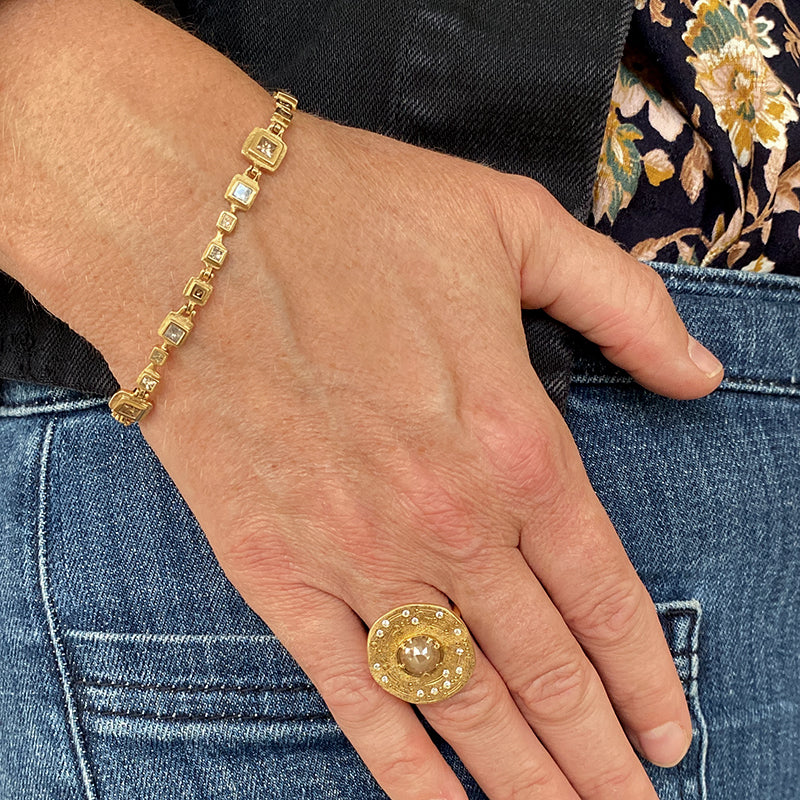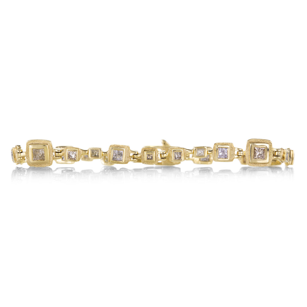 Add a layer of modern artistry to your look in this exquisitely crafted 18k yellow gold bracelet from Audrius Krulis. An endless parade of princess cut diamonds comprise every link, set in lavishly textured bezels. Total length measures 7 1/2” with square lobster clasp. Handcrafted in Montrose, NY, U.S.